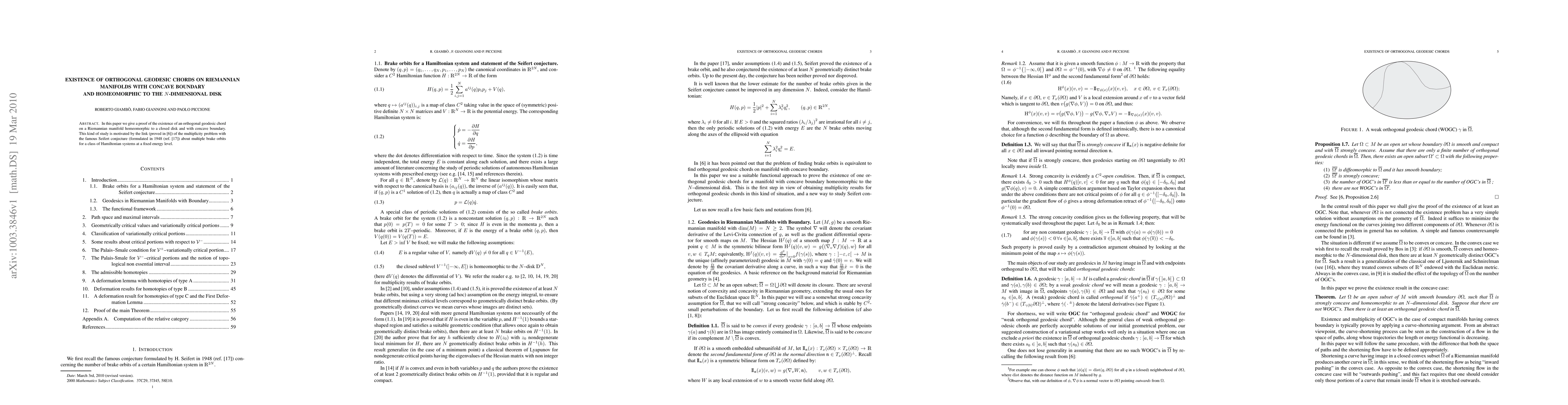 In this paper we give a proof of the existence of an orthogonal geodesic chord on a Riemannian manifold homeomorphic to a closed disk and with concave boundary. This kind of study is motivated by the link of the multiplicity problem with the famous Seifert conjecture (formulated in 1948) about multiple brake orbits for a class of Hamiltonian systems at a fixed energy level.