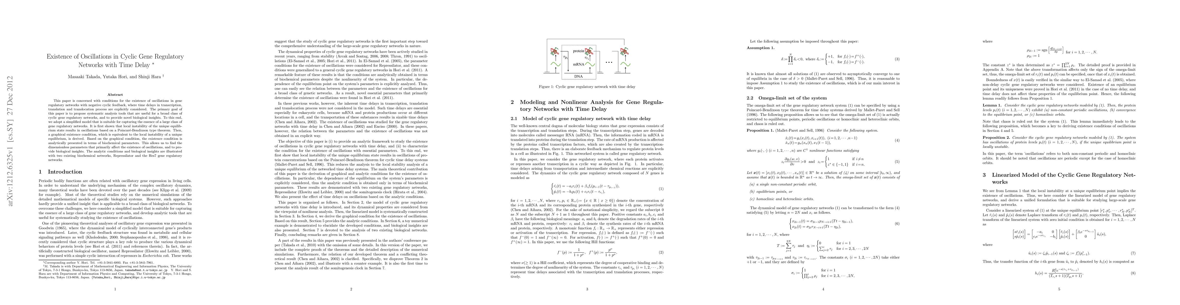 This paper investigates the conditions for oscillations in cyclic gene regulatory networks with time delays, providing systematic analysis tools and novel biological insights. It derives a graphical condition for oscillation existence based on local instability, and illustrates the findings with the Repressilator and Hes7 gene regulatory networks.