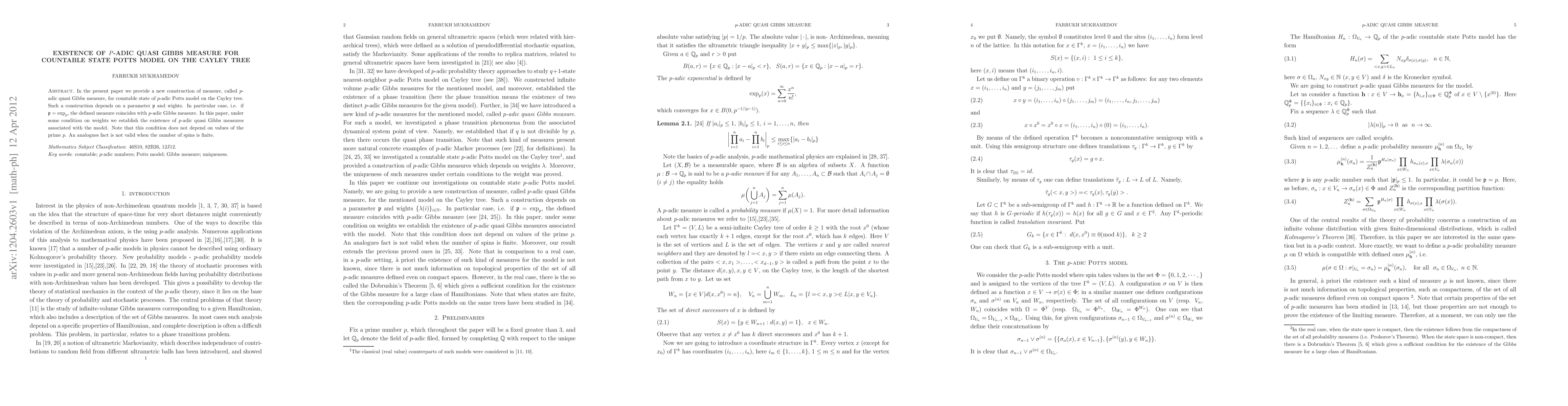 In the present paper we provide a new construction of measure, called $p$-adic quasi Gibbs measure, for countable state of $p$-adic Potts model on the Cayley tree. Such a construction depends on a parameter $\frak{p}$ and wights. In particular case, i.e. if $\frak{p}=\exp_p$, the defined measure coincides with $p$-adic Gibbs measure. In this paper, under some condition on weights we establish the existence of $p$-adic quasi Gibbs measures associated with the model. Note that this condition does not depend on values of the prime $p$. An analogues fact is not valid when the number of spins is finite.