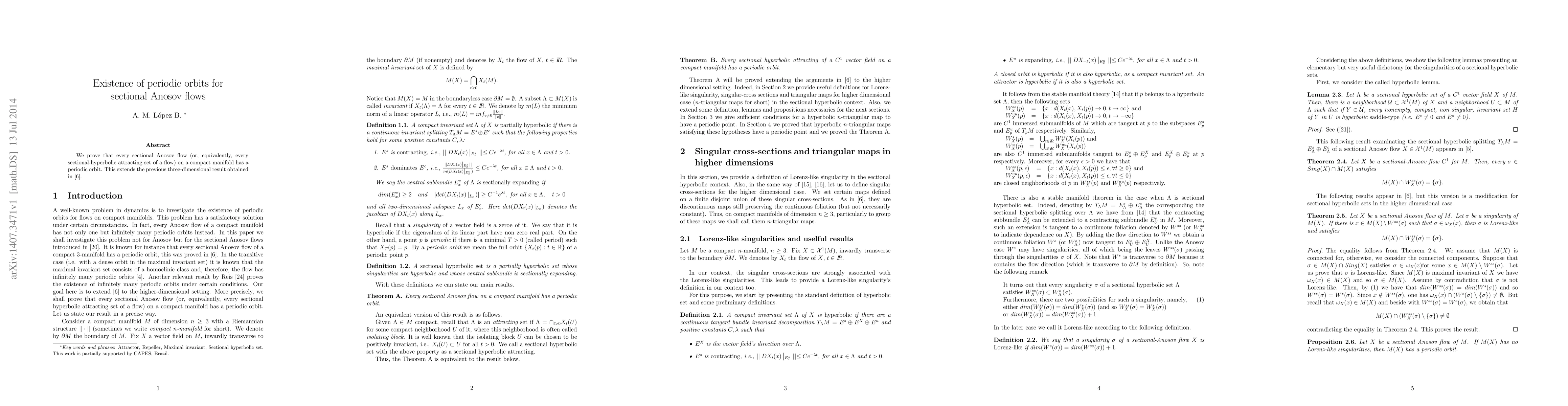 The paper proves the existence of periodic orbits in every sectional Anosov flow on a compact manifold, extending previous findings in three dimensions. This result applies to sectional-hyperbolic attracting sets of flows.