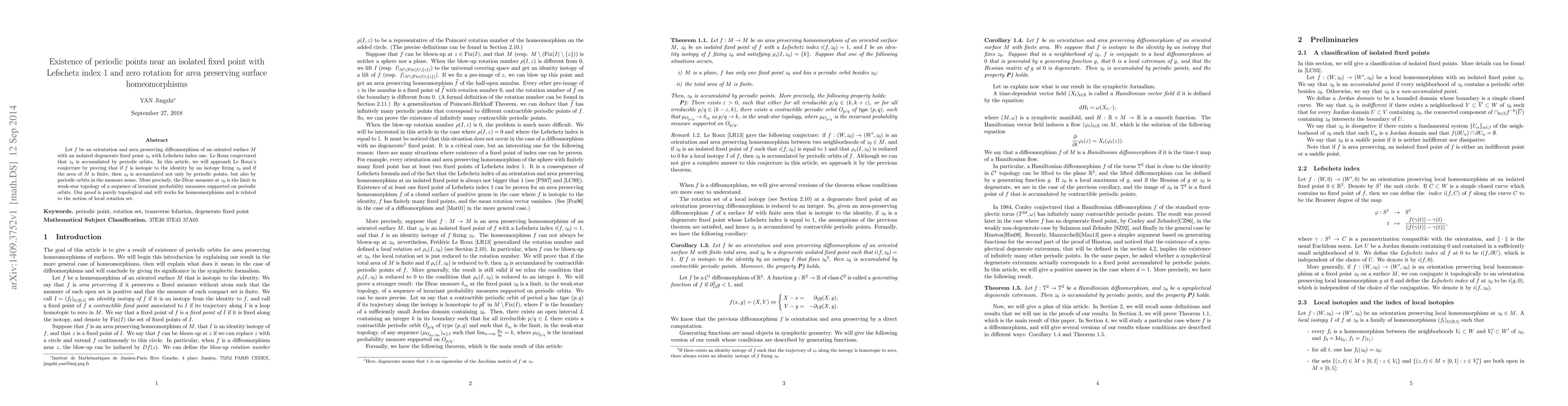 This paper proves that for area-preserving diffeomorphisms with an isolated fixed point of Lefschetz index one, the point is surrounded by periodic orbits, confirming a conjecture by Le Roux. The result is achieved through a purely topological approach and applies to homeomorphisms.