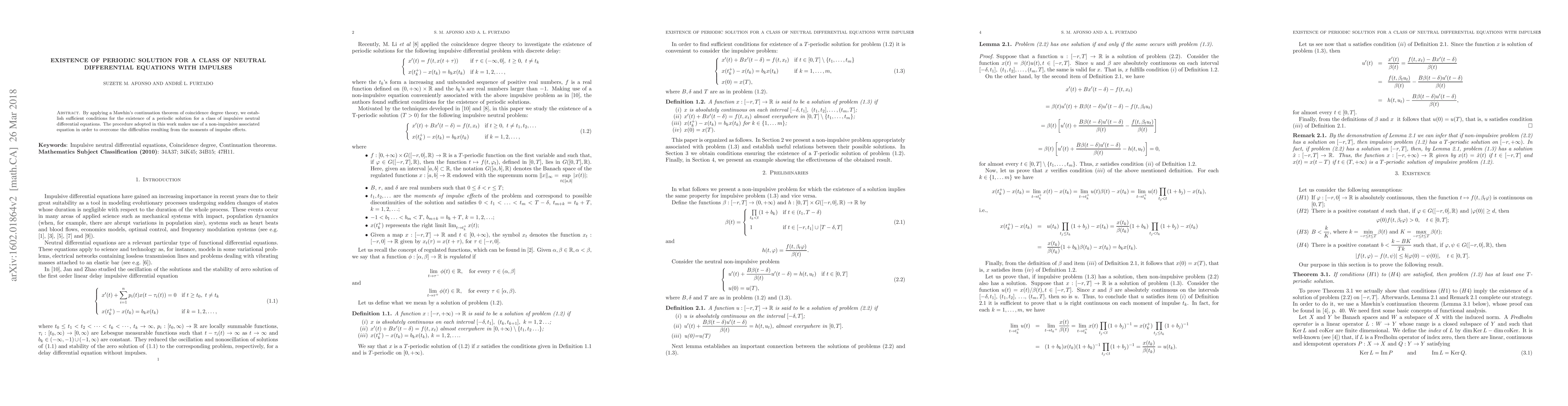 By applying a Mawhin's continuation theorem of coincidence degree theory, we establish sufficient conditions for the existence of a periodic solution for a class of impulsive neutral differential equations. The procedure adopted in this work makes use of a non-impulsive associated equation in order to overcome the difficulties resulting from the moments of impulse effects. Under particular assumptions this solution is continuously differentiable on each interval with no impulse effect.