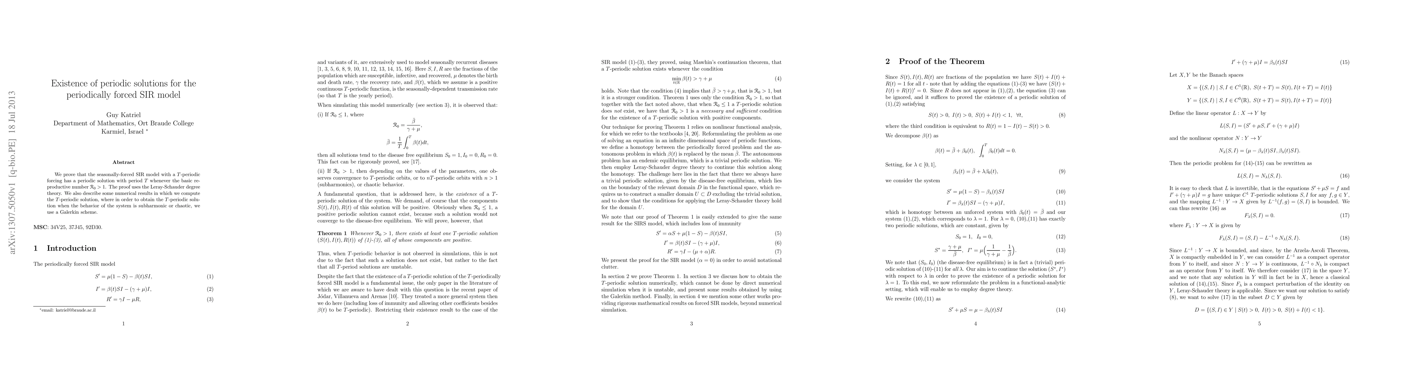 This paper proves the existence of T-periodic solutions in a seasonally-forced SIR model when the basic reproductive number R0 exceeds 1, employing Leray-Schauder degree theory. Numerical results demonstrate the computation of T-periodic solutions using a Galerkin scheme for subharmonic or chaotic system behaviors.