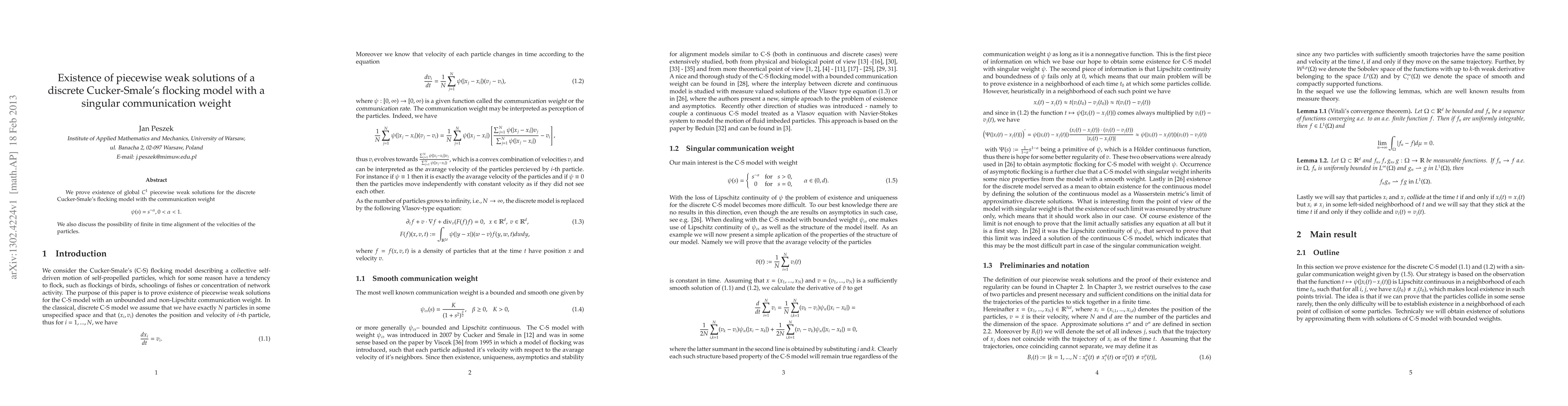 We prove existence of global $C^1$ piecewise weak solutions for the discrete Cucker-Smale's flocking model with the communication weight $\psi(s)=s^{-\alpha}, 0<\alpha<1.$ We also discuss the possibility of finite in time alignment of the velocities of the particles.