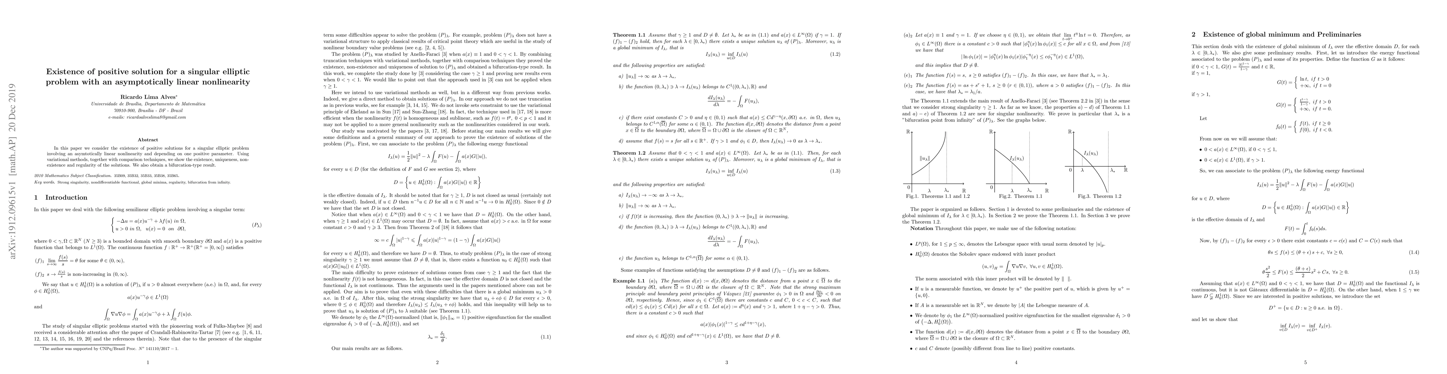 This paper explores the existence of positive solutions for a singular elliptic problem with an asymptotically linear nonlinearity, demonstrating their existence, uniqueness, non-existence, and regularity via variational methods and comparison techniques, and presenting a bifurcation-type result.