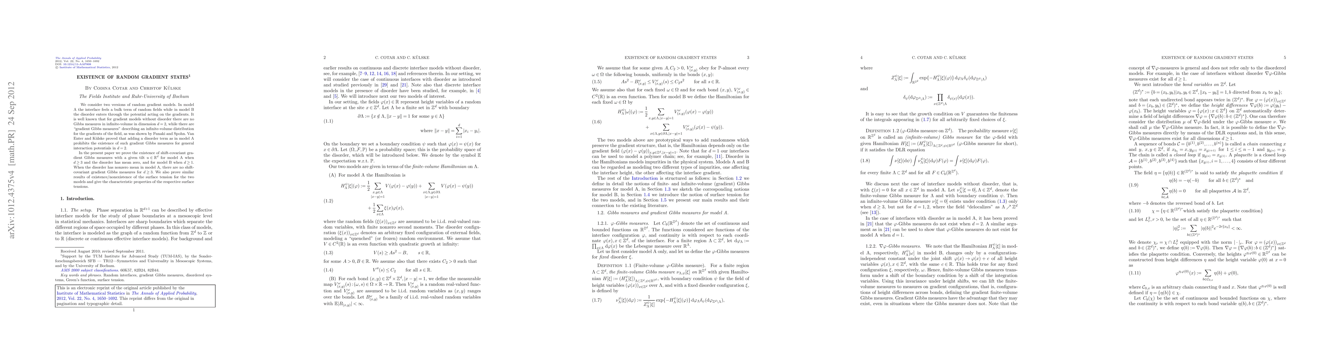 We consider two versions of random gradient models. In model A the interface feels a bulk term of random fields while in model B the disorder enters through the potential acting on the gradients. It is well known that for gradient models without disorder there are no Gibbs measures in infinite-volume in dimension d=2, while there are "gradient Gibbs measures" describing an infinite-volume distribution for the gradients of the field, as was shown by Funaki and Spohn. Van Enter and K\"{u}lske proved that adding a disorder term as in model A prohibits the existence of such gradient Gibbs measures for general interaction potentials in $d=2$. In the present paper we prove the existence of shift-covariant gradient Gibbs measures with a given tilt $u\in \mathbb{R}^d$ for model A when $d\geq3$ and the disorder has mean zero, and for model B when $d\geq1$. When the disorder has nonzero mean in model A, there are no shift-covariant gradient Gibbs measures for $d\ge3$. We also prove similar results of existence/nonexistence of the surface tension for the two models and give the characteristic properties of the respective surface tensions.