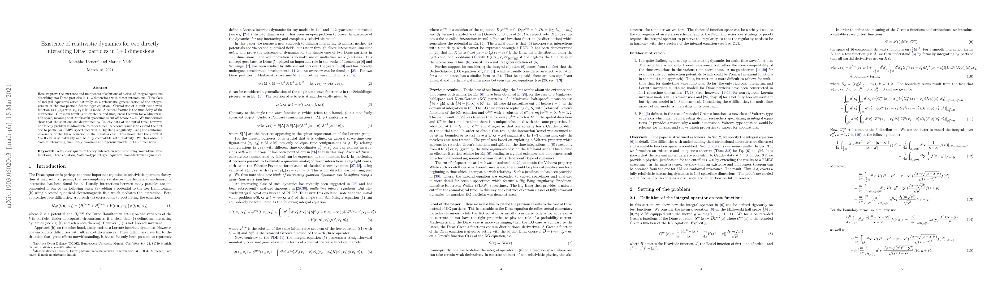 Here we prove the existence and uniqueness of solutions of a class of integral equations describing two Dirac particles in 1+3 dimensions with direct interactions. This class of integral equations arises naturally as a relativistic generalization of the integral version of the two-particle Schr\"odinger equation. Crucial use of a multi-time wave function $\psi(x_1,x_2)$ with $x_1,x_2 \in \mathbb{R}^4$ is made. A central feature is the time delay of the interaction. Our main result is an existence and uniqueness theorem for a Minkowski half space, meaning that Minkowski spacetime is cut off before $t=0$. We furthermore show that the solutions are determined by Cauchy data at the initial time; however, no Cauchy problem is admissible at other times. A second result is to extend the first one to particular FLRW spacetimes with a Big Bang singularity, using the conformal invariance of the Dirac equation in the massless case. This shows that the cutoff at $t=0$ can arise naturally and be fully compatible with relativity. We thus obtain a class of interacting, manifestly covariant and rigorous models in 1+3 dimensions.