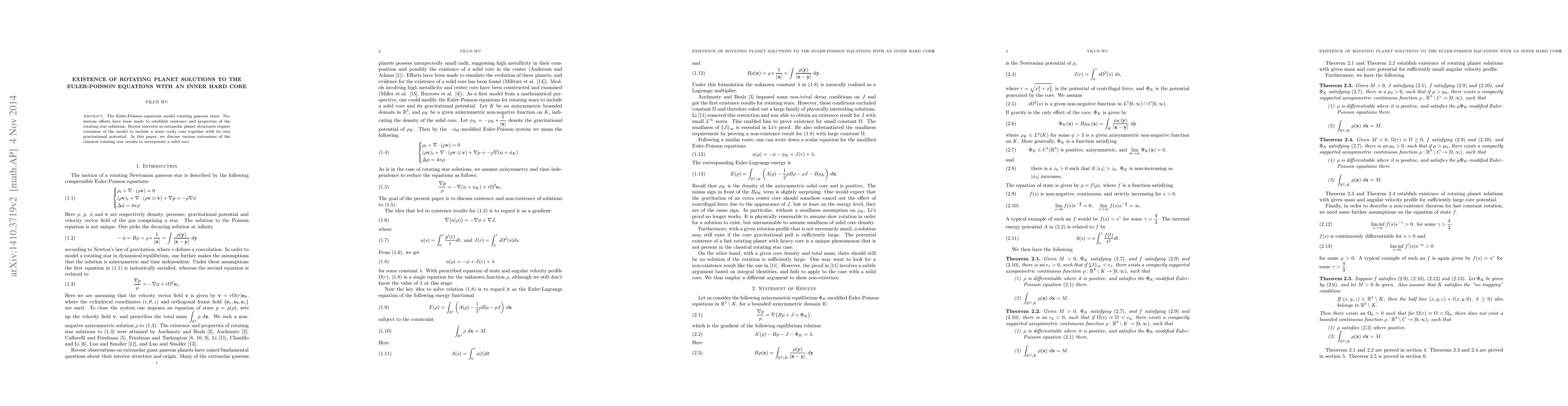 Summary: This paper investigates the existence of rotating planet solutions for the Euler-Poisson equations that include a solid inner core, extending classical rotating star models to accommodate extrasolar planet structures with rocky interiors.