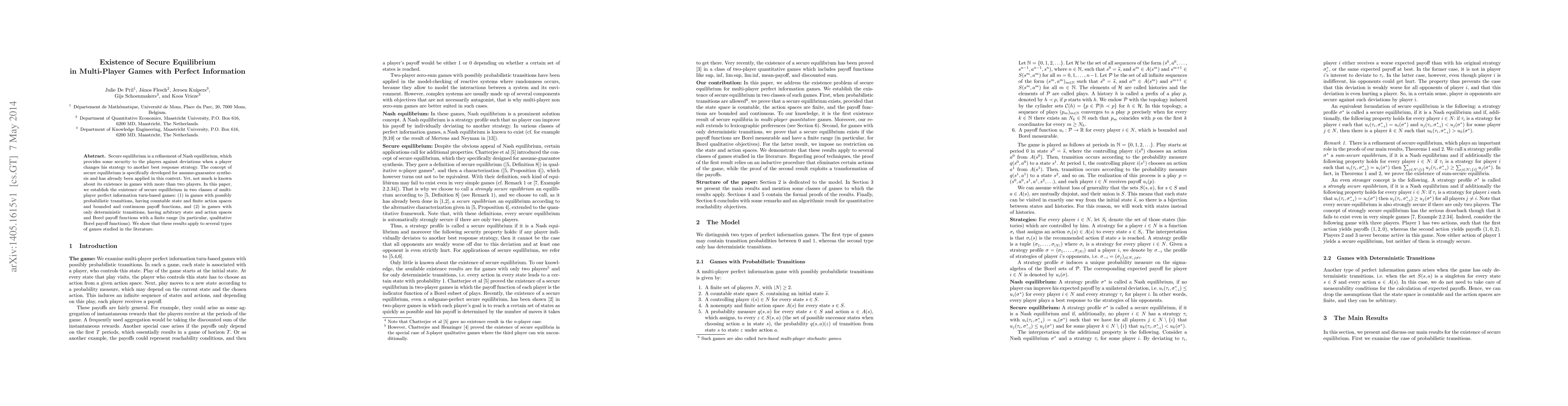 This paper establishes the existence of secure equilibrium in multi-player perfect information games, specifically for two classes: (1) games with probabilistic transitions and (2) games with deterministic transitions. The findings extend secure equilibrium concepts beyond two-player scenarios to broader game contexts.