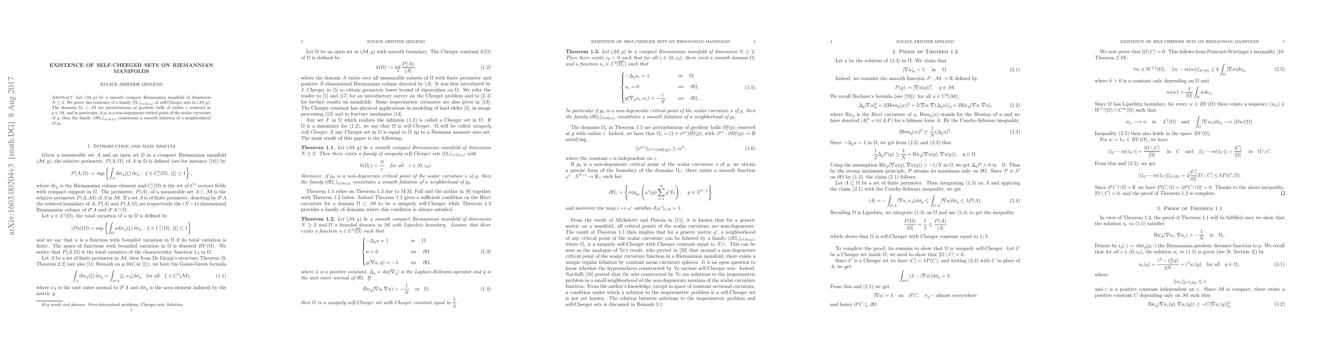 Let $(\mathcal{M},g)$ be a compact Riemannian manifold of dimension $N\geq 2$. We prove the existence of a family $(\Omega_\varepsilon)_{\varepsilon\in (0,\varepsilon_0)}$ of self-Cheeger sets in $(\mathcal{M},g)$ . The domains $\Omega_\varepsilon\subset\mathcal{M}$ are perturbations of geodesic balls of radius $\varepsilon$ centered at $p \in \mathcal{M}$, and in particular, if $p_0$ is a non-degenerate critical point of the scalar curvature of $g$, then the family $(\partial \Omega_\varepsilon)_{\varepsilon \in (0,\varepsilon_0)}$ constitutes a smooth foliation of a neighborhood of $p_0$.