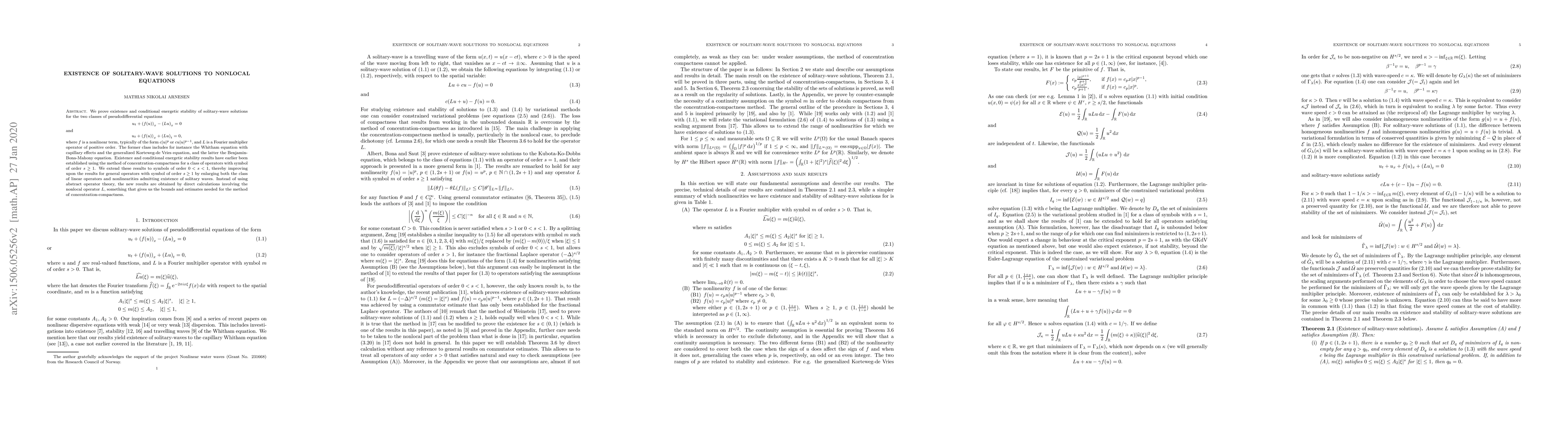 The paper establishes the existence and conditional energetic stability of solitary-wave solutions for two classes of pseudodifferential equations involving nonlocal operators. It extends prior results to lower-order operators and nonlinearities, achieving improved bounds using direct calculations rather than abstract operator theory.