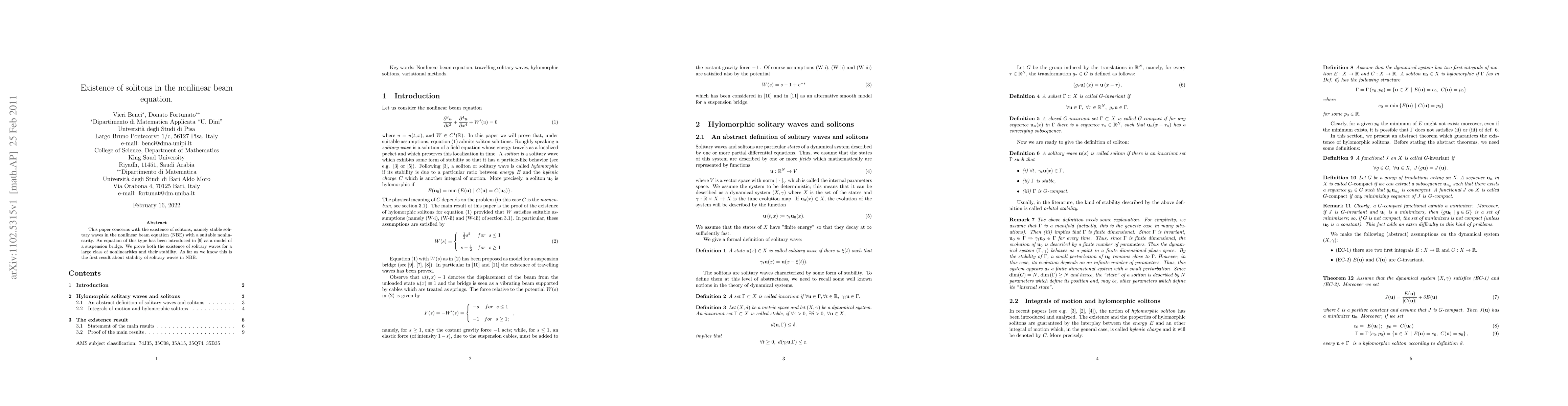 This paper concerns with the existence of solitons, namely stable solitary waves in the nonlinear beam equation (NBE) with a suitable nonlinearity. An equation of this type has been introduced by P.J. McKenna and W. Walter as a model of a suspension bridge. We prove both the existence of solitary waves for a large class of nonlinearities and their stability. As far as we know this is the first result about stability of solitary waves in NBE.