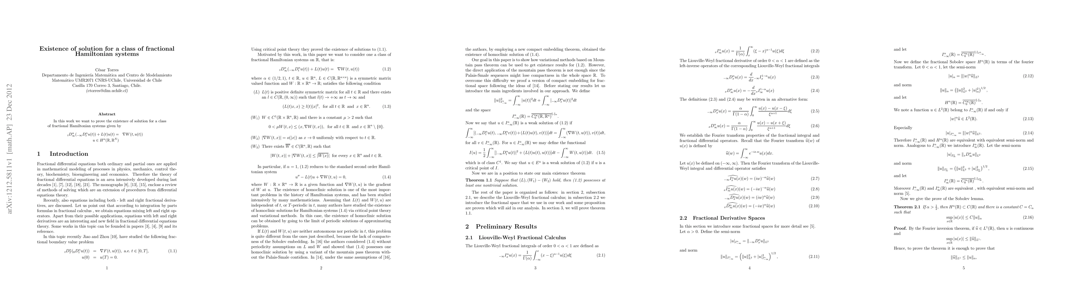 This research paper proves the existence of solutions for a class of fractional Hamiltonian systems, which involve differential equations with non-integer exponents. It establishes the existence of solutions for a specific type of system, contributing to our understanding of dynamical systems in mathematics and physics.