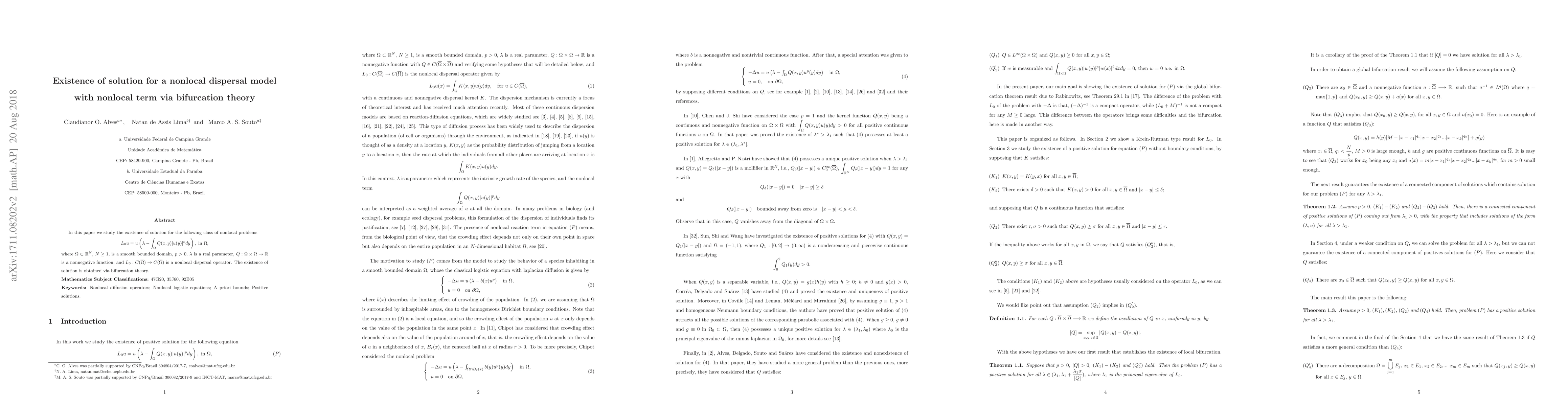 This paper investigates the existence of solutions for a nonlocal dispersal model using bifurcation theory, focusing on the equation \( L_0u = u \left(\lambda - \int_{\Omega}Q(x,y) |u(y)|^p dy \right) \) in a bounded domain \(\Omega\). The study employs bifurcation techniques to determine the conditions under which solutions exist.