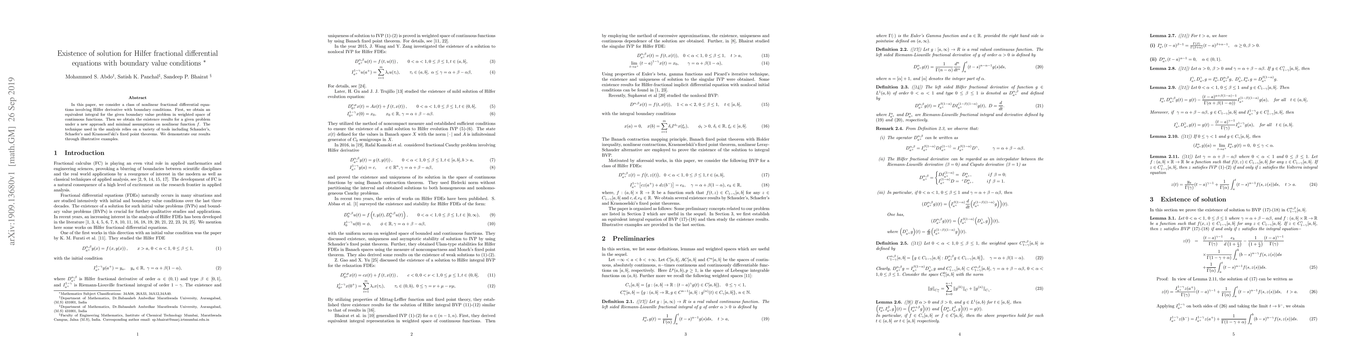 Summary: This paper establishes existence results for nonlinear fractional differential equations with Hilfer derivatives and boundary conditions, utilizing Schauder, Schaefer, and Krasnoselski fixed point theorems, and demonstrates the findings with examples.
