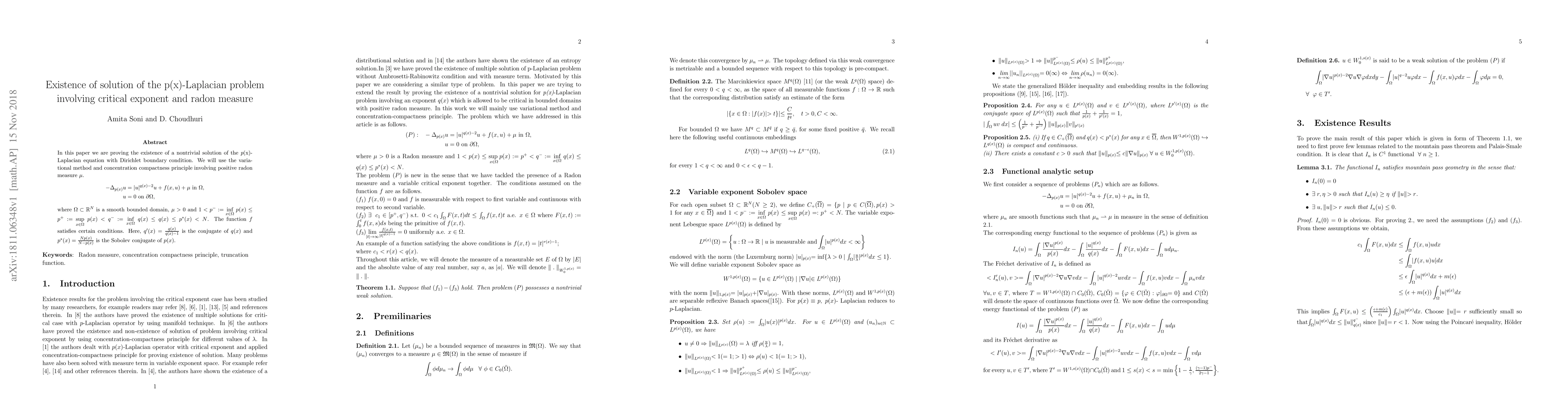 In this paper we are proving the existence of a nontrivial solution of the ${p}(x)$- Laplacian equation with Dirichlet boundary condition. We will use the variational method and concentration compactness principle involving positive radon measure $\mu$. \begin{align*} \begin{split} -\Delta_{p(x)}u & = |u|^{q(x)-2}u+f(x,u)+\mu\,\,\mbox{in}\,\,\Omega,\\ u & = 0\,\, \mbox{on}\,\, \partial\Omega, \end{split} \end{align*} where $\Omega \subset \mathbb{R}^N$ is a smooth bounded domain, $\mu > 0$ and $1 < p^{-}:=\underset{x\in \Omega}{\text{inf}}\;p(x) \leq p^{+}:= \underset{x\in \Omega}{\text{sup}}\;p(x) < q^{-}:=\underset{x\in \Omega}{\text{inf}}\;q(x)\leq q(x) \leq p^{\ast}(x) < N$. The function $f$ satisfies certain conditions. Here, $q^{\prime}(x)=\frac{q(x)}{q(x)-1}$ is the conjugate of $q(x)$ and $p^{\ast}(x)=\frac{Np(x)}{N-p(x)}$ is the Sobolev conjugate of $p(x)$.
