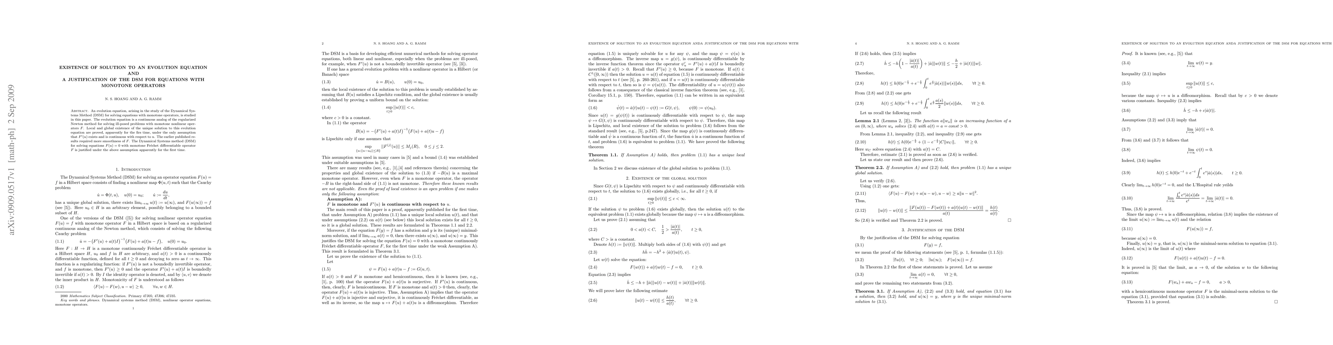 An evolution equation, arising in the study of the Dynamical Systems Method (DSM) for solving equations with monotone operators, is studied in this paper. The evolution equation is a continuous analog of the regularized Newton method for solving ill-posed problems with monotone nonlinear operators $F$. Local and global existence of the unique solution to this evolution equation are proved, apparently for the firs time, under the only assumption that $F'(u)$ exists and is continuous with respect to $u$. The earlier published results required more smoothness of $F$. The Dynamical Systems method (DSM) for solving equations $F(u)=0$ with monotone Fr\'echet differentiable operator $F$ is justified under the above assumption apparently for the first time.
