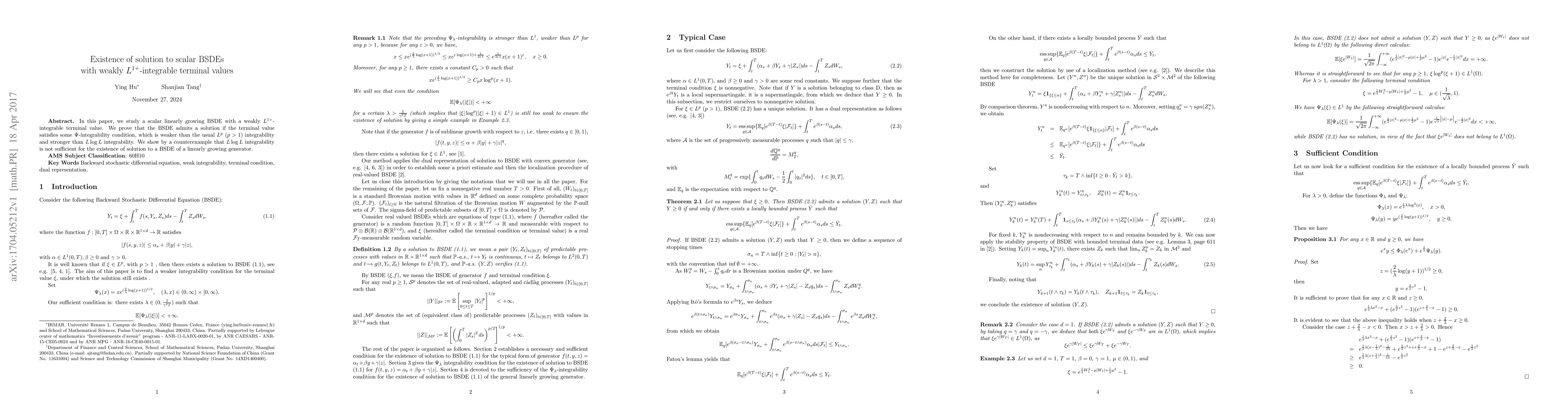 A research paper proves that a linearly growing BSDE has a solution if its terminal value is weakly $L^{1+}$-integrable, a condition weaker than usual $L^p$ integrability but stronger than $L extlog L$ integrability.