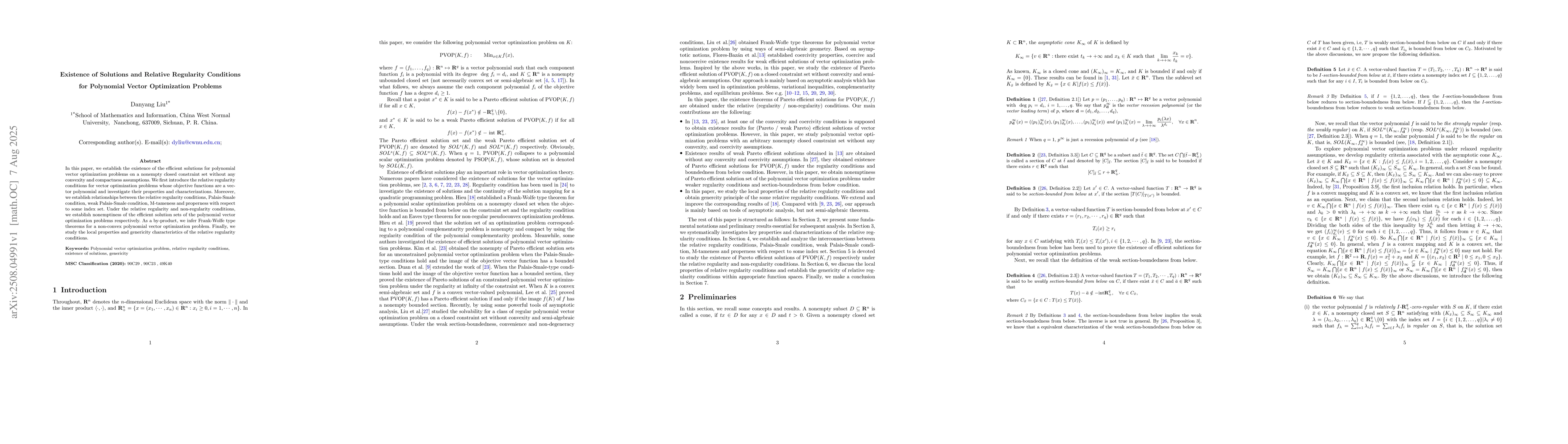 In this paper, we establish the existence of the efficient solutions for polynomial vector optimization problems on a nonempty closed constraint set without any convexity and compactness assumptions. We first introduce the relative regularity conditions for vector optimization problems whose objective functions are a vector polynomial and investigate their properties and characterizations. Moreover, we establish relationships between the relative regularity conditions, Palais-Smale condition, weak Palais-Smale condition, M-tameness and properness with respect to some index set. Under the relative regularity and non-regularity conditions, we establish nonemptiness of the efficient solution sets of the polynomial vector optimization problems respectively. As a by-product, we infer Frank-Wolfe type theorems for a non-convex polynomial vector optimization problem. Finally, we study the local properties and genericity characteristics of the relative regularity conditions.