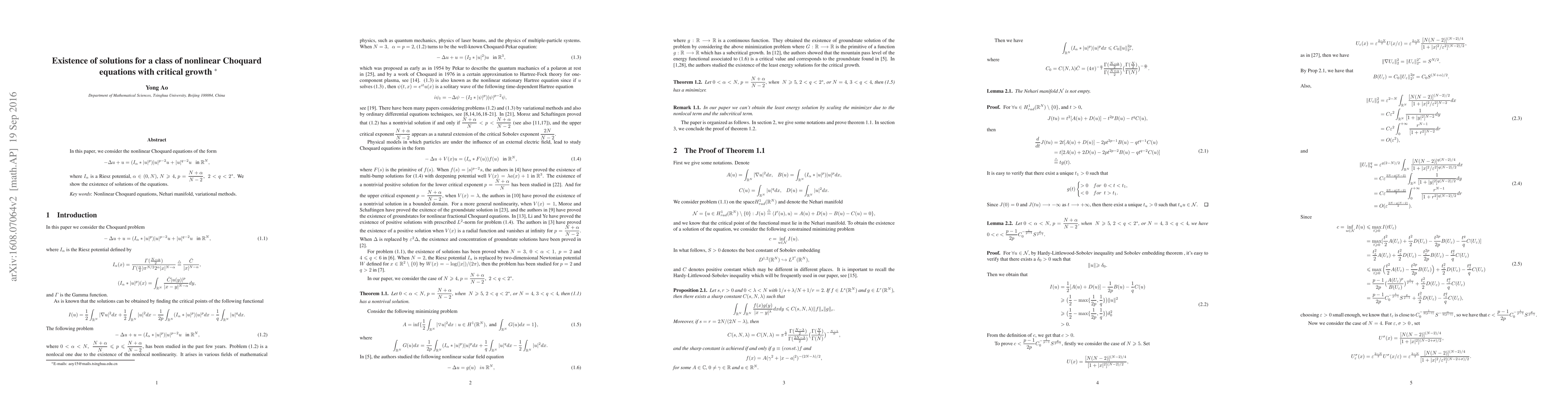 Summary: This paper investigates nonlinear Choquard equations with critical growth, demonstrating the existence of solutions and proving the existence of a minimizer for the associated minimizing problem.