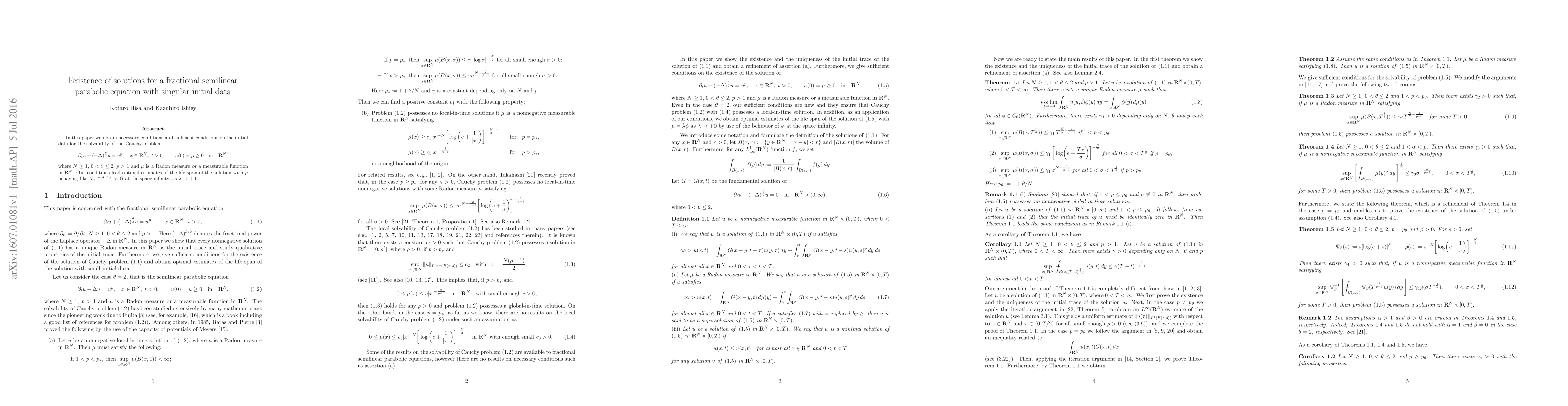 In this paper we obtain necessary conditions and sufficient conditions on the initial data for the solvability of the Cauchy problem $$ \partial_t u+(-\Delta)^{\frac{\theta}{2}}u=u^p,\quad x\in{\bf R}^N,\,\,t>0, \qquad u(0)=\mu\ge 0\quad\mbox{in}\quad{\bf R}^N, $$ where $N\ge 1$, $0<\theta\le 2$, $p>1$ and $\mu$ is a Radon measure or a measurable function in ${\bf R}^N$. Our conditions lead optimal estimates of the life span of the solution with $\mu$ behaving like $\lambda |x|^{-A}$ ($A>0$) at the space infinity, as $\lambda \to +0$.