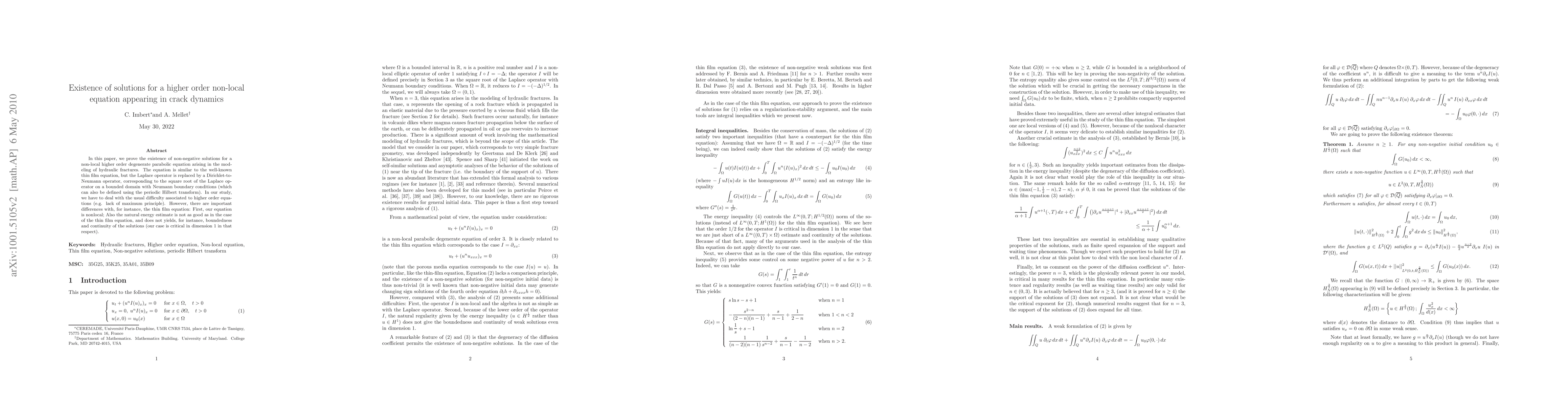 This paper proves the existence of non-negative solutions to a higher order non-local equation in crack dynamics, addressing challenges unique to this specific problem.