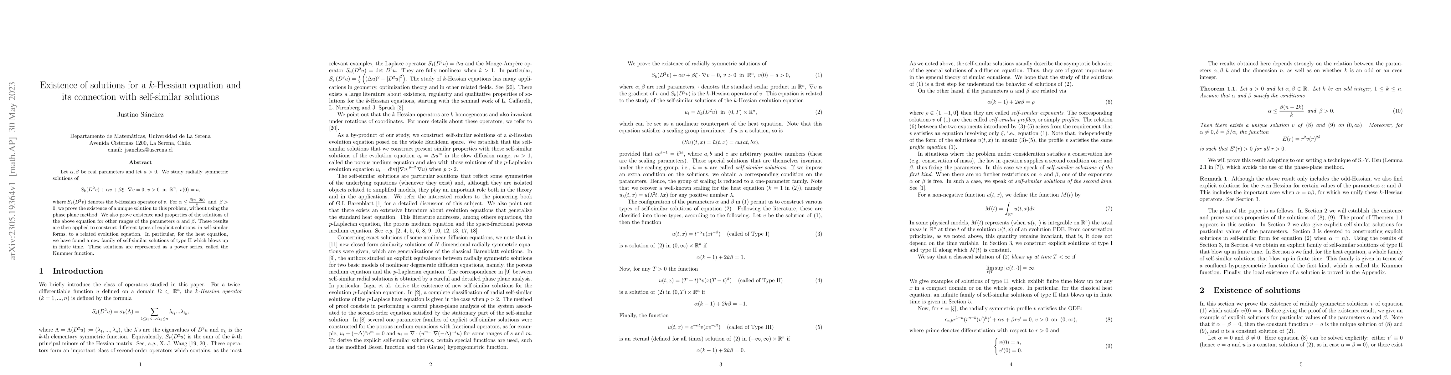 This paper proves the existence of unique solutions for a $k$-Hessian equation under certain parameter constraints, and explores the connection to self-similar solutions, including a new family of type II self-similar solutions for the heat equation that blow up in finite time, represented by the Kummer function.