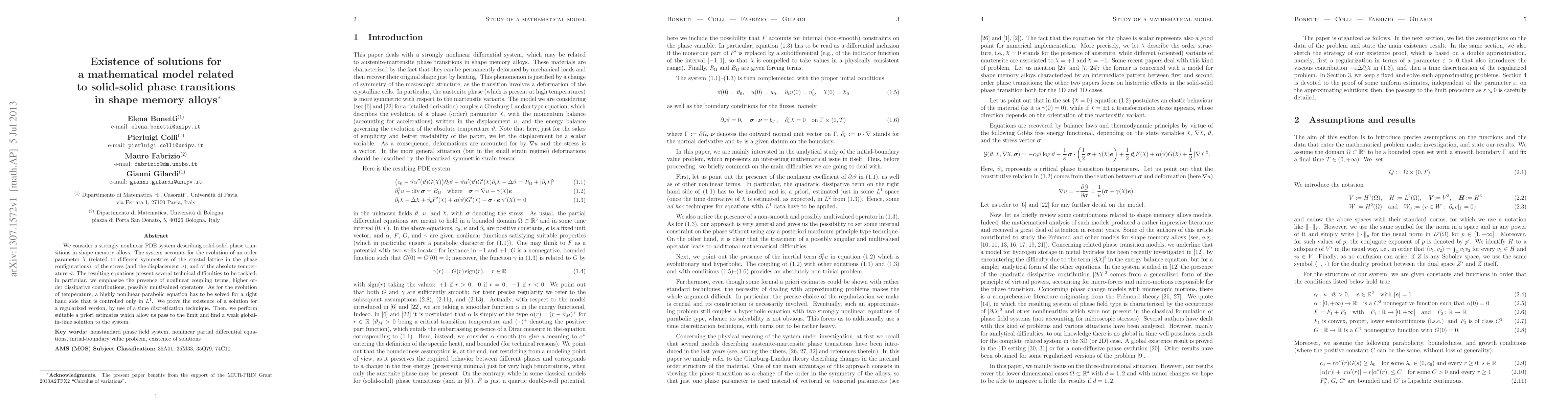 This paper investigates the existence of solutions for a strongly nonlinear PDE system modeling solid-solid phase transitions in shape memory alloys, addressing technical challenges like nonlinear coupling and higher-order dissipative terms. The authors prove the existence of a solution for a regularized version using time discretization and obtain a weak global-in-time solution through a priori estimates.