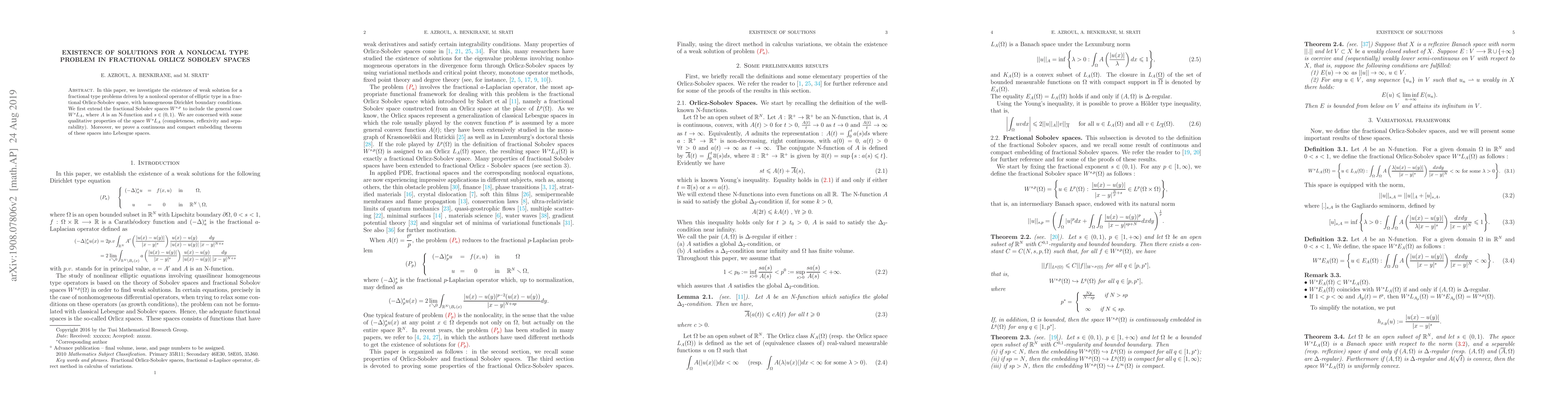 In this paper, we investigate the existence of weak solution for a fractional type problems driven by a nonlocal operator of elliptic type in a fractional Orlicz-Sobolev space, with homogeneous Dirichlet boundary conditions. We first extend the fractional Sobolev spaces $W^{s,p}$ to include the general case $W^sL_A$, where $A$ is an N-function and $s\in (0,1)$. We are concerned with some qualitative properties of the space $W^sL_A$ (completeness, reflexivity and separability). Moreover, we prove a continuous and compact embedding theorem of these spaces into Lebesgue spaces.