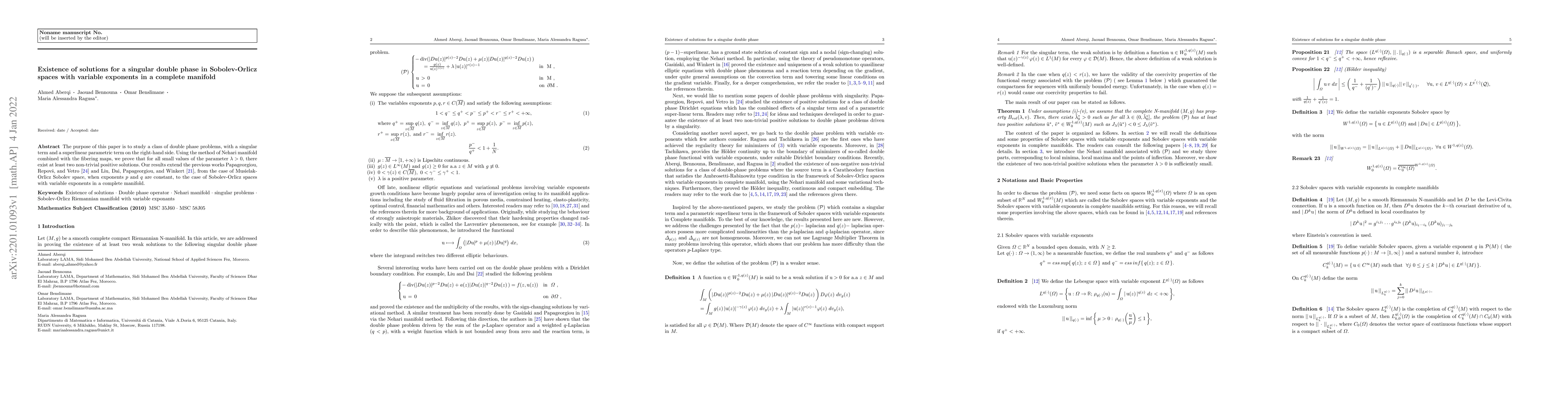This paper explores double phase problems with singular and superlinear terms, proving the existence of at least two non-trivial positive solutions for small parameter values using Nehari manifold and fibering maps. The results extend previous findings to Sobolev-Orlicz spaces with variable exponents in a complete manifold.