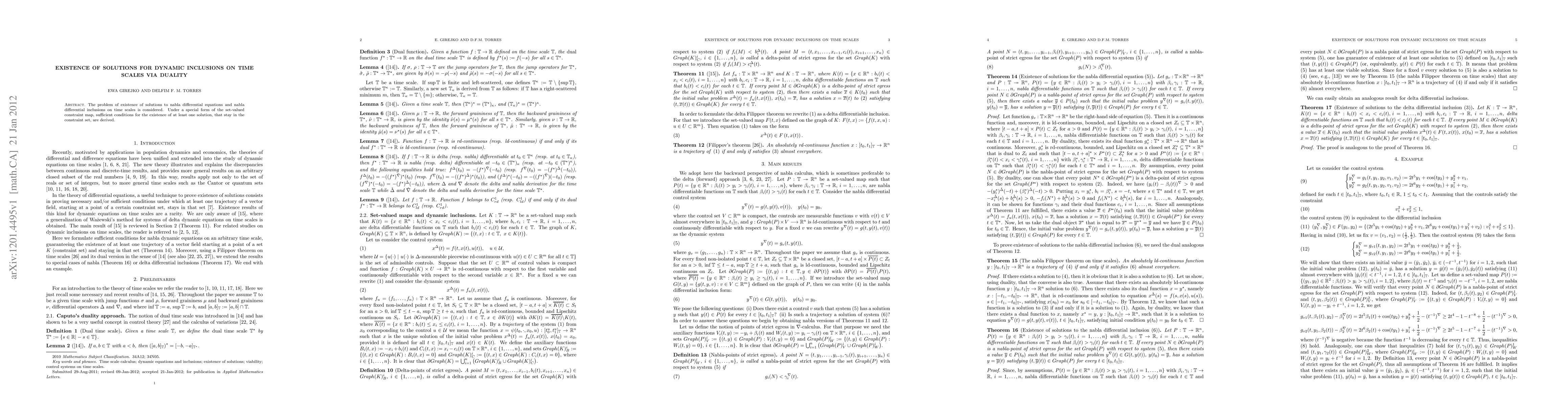 This paper explores the existence of solutions for nabla differential equations and inclusions on time scales, deriving sufficient conditions for at least one solution within a specified constraint set. The study employs duality principles to establish these conditions.