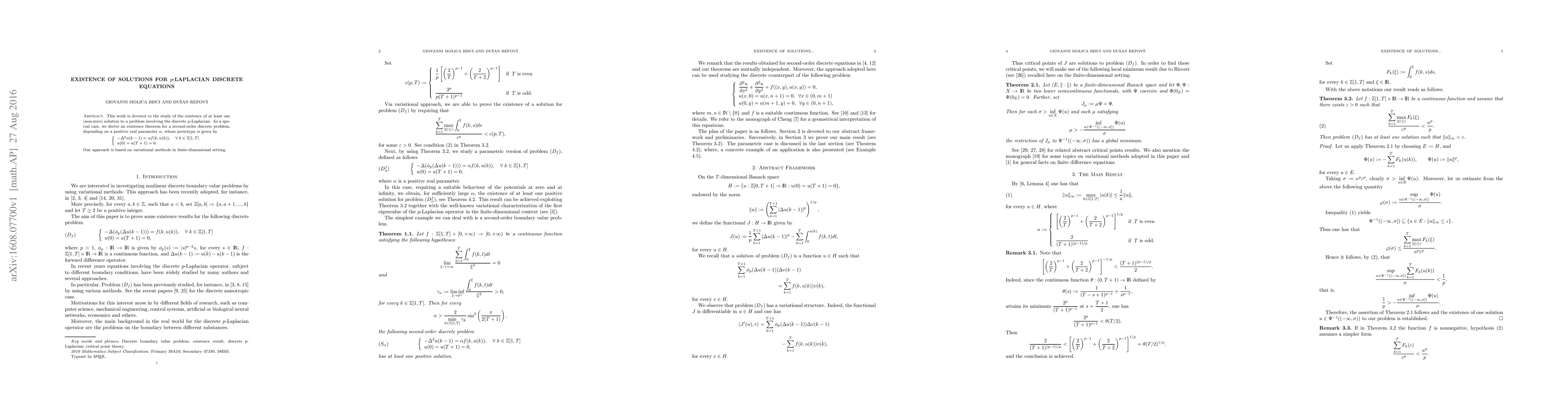 This research establishes the existence of non-zero solutions for discrete $p$-Laplacian equations using variational methods in finite dimensions. It includes a specific theorem for a second-order discrete problem with a parameter $alpha$, exemplified by a given equation with boundary conditions.