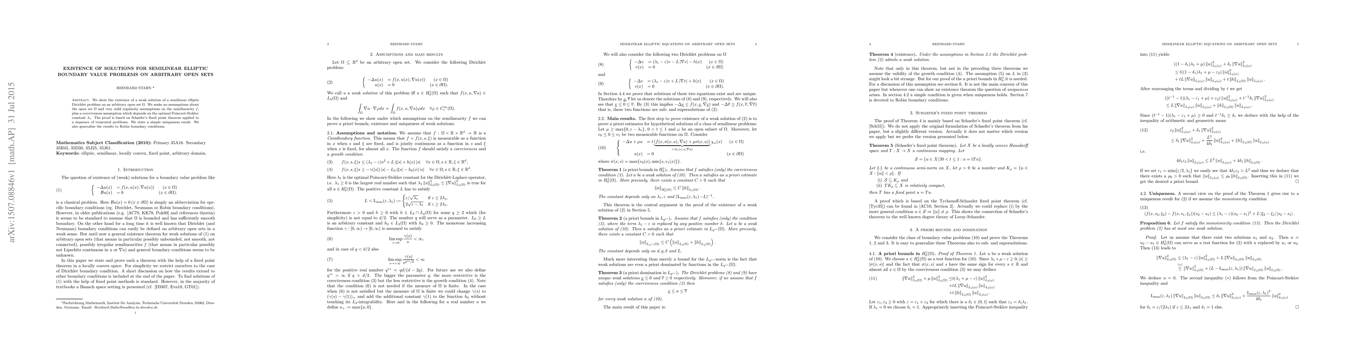 This paper demonstrates the existence of weak solutions for semilinear elliptic Dirichlet and Robin problems on any open set, with minimal regularity assumptions and a coerciveness condition tied to the optimal Poincare-Steklov constant, using Schaefer's fixed point theorem. A simple uniqueness result is also presented.