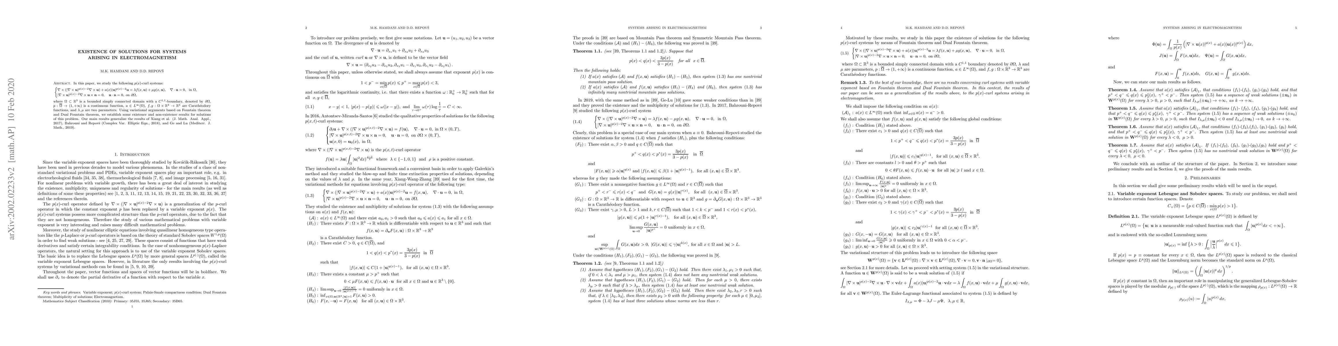 This paper investigates the existence of solutions for $p(x)$-curl systems arising in electromagnetism, establishing existence and non-existence results using variational methods. The results generalize previous findings in the field.