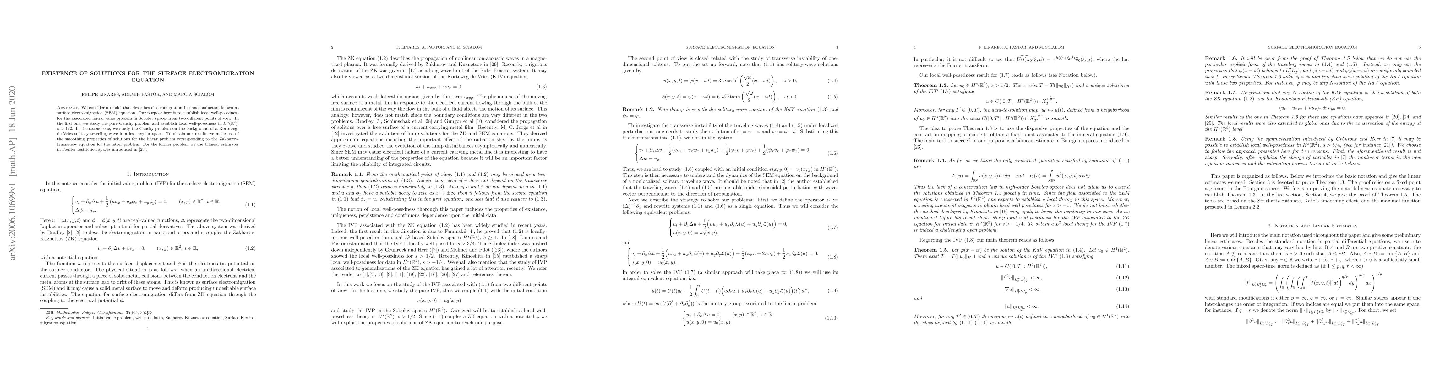 We consider a model that describes electromigration in nanoconductors known as surface electromigration (SEM) equation. Our purpose here is to establish local well-posedness for the associated initial value problem in Sobolev spaces from two different points of view. In the first one, we study the pure Cauchy problem and establish local well-posedness in $H^s(\mathbb{R}^2)$, $s>1/2$. In the second one, we study the Cauchy problem on the background of a Korteweg-de Vries solitary traveling wave in a less regular space. To obtain our results we make use of the smoothing properties of solutions for the linear problem corresponding to the Zakharov-Kuznetsov equation for the latter problem. For the former problem we use bilinear estimates in Fourier restriction spaces established by Molinet and Pilod.