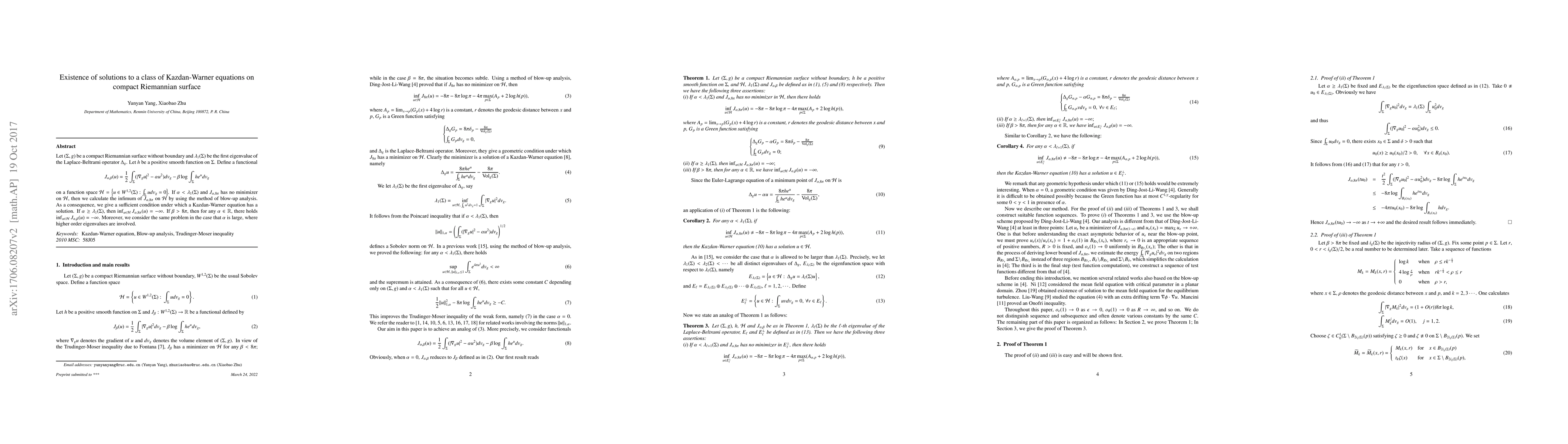 Let $(\Sigma,g)$ be a compact Riemannian surface without boundary and $\lambda_1(\Sigma)$ be the first eigenvalue of the Laplace-Beltrami operator $\Delta_g$. Let $h$ be a positive smooth function on $\Sigma$. Define a functional $$J_{\alpha,\beta}(u)=\frac{1}{2}\int_\Sigma(|\nabla_gu|^2-\alpha u^2)dv_g-\beta\log\int_\Sigma he^udv_g$$ on a function space $\mathcal{H}=\left\{u\in W^{1,2}(\Sigma): \int_\Sigma udv_g=0\right\}$. If $\alpha<\lambda_1(\Sigma)$ and $J_{\alpha,8\pi}$ has no minimizer on $\mathcal{H}$, then we calculate the infimum of $J_{\alpha,8\pi}$ on $\mathcal{H}$ by using the method of blow-up analysis. As a consequence, we give a sufficient condition under which a Kazdan-Warner equation has a solution. If $\alpha\geq \lambda_1(\Sigma)$, then $\inf_{u\in\mathcal{H}}J_{\alpha,8\pi}(u)=-\infty$. If $\beta>8\pi$, then for any $\alpha\in\mathbb{R}$, there holds $\inf_{u\in\mathcal{H}}J_{\alpha,\beta}(u)=-\infty$. Moreover, we consider the same problem in the case that $\alpha$ is large, where higher order eigenvalues are involved.