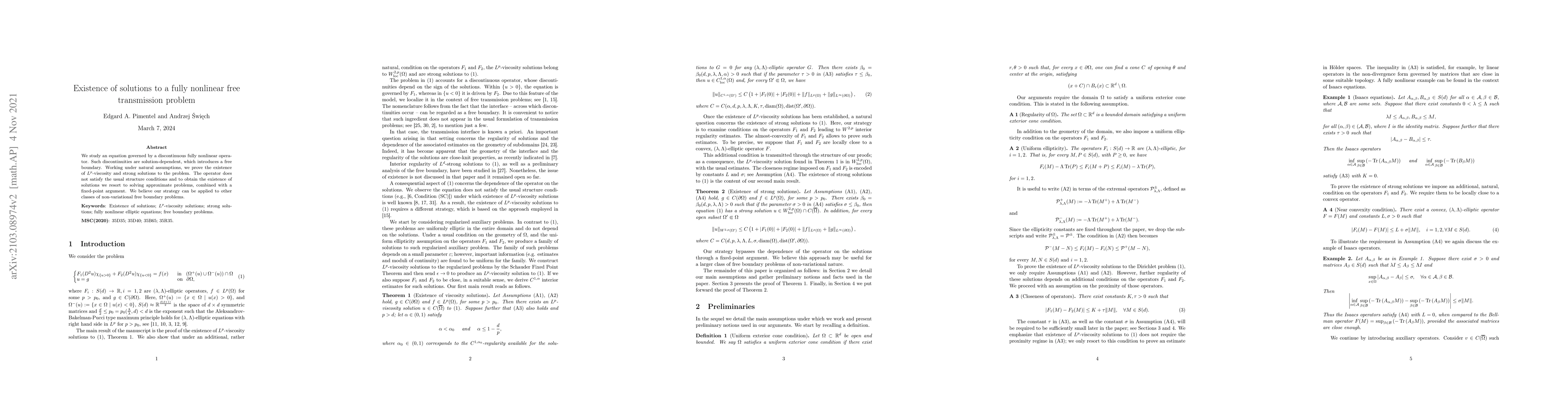 Researchers prove the existence of solutions to a free transmission problem governed by a discontinuous fully nonlinear operator under natural assumptions.