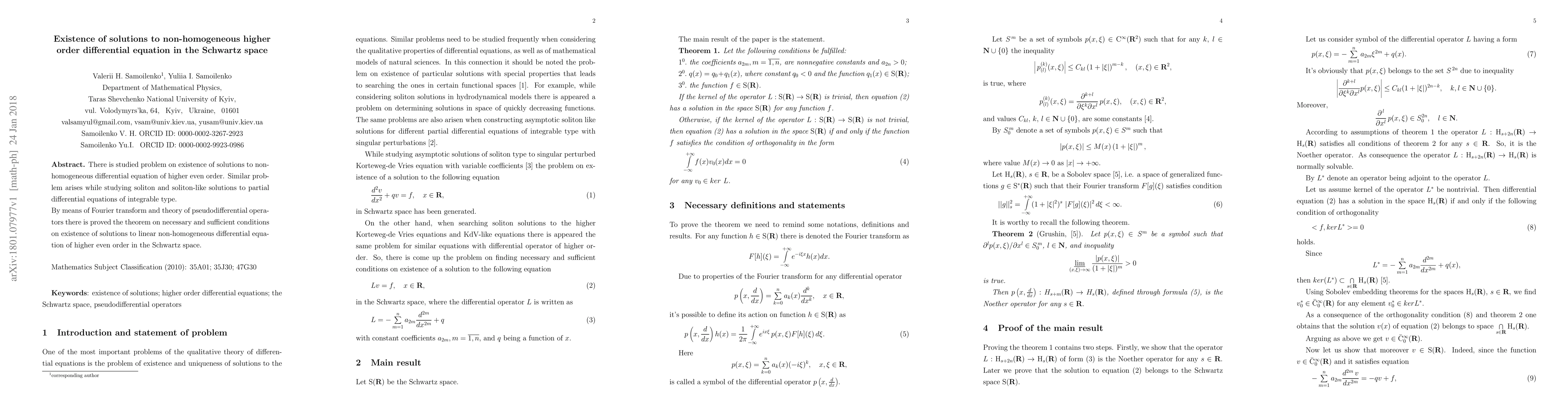 There is studied problem on existence of solutions to non-homogeneous differential equation of higher even order. Similar problem arises while studying soliton and soliton-like solutions to partial differential equations of integrable type. By means of Fourier transform and theory of pseudodifferential operators there is proved the theorem on necessary and sufficient conditions on existence of solutions to linear non-homogeneous differential equation of higher even order in the Schwartz space.