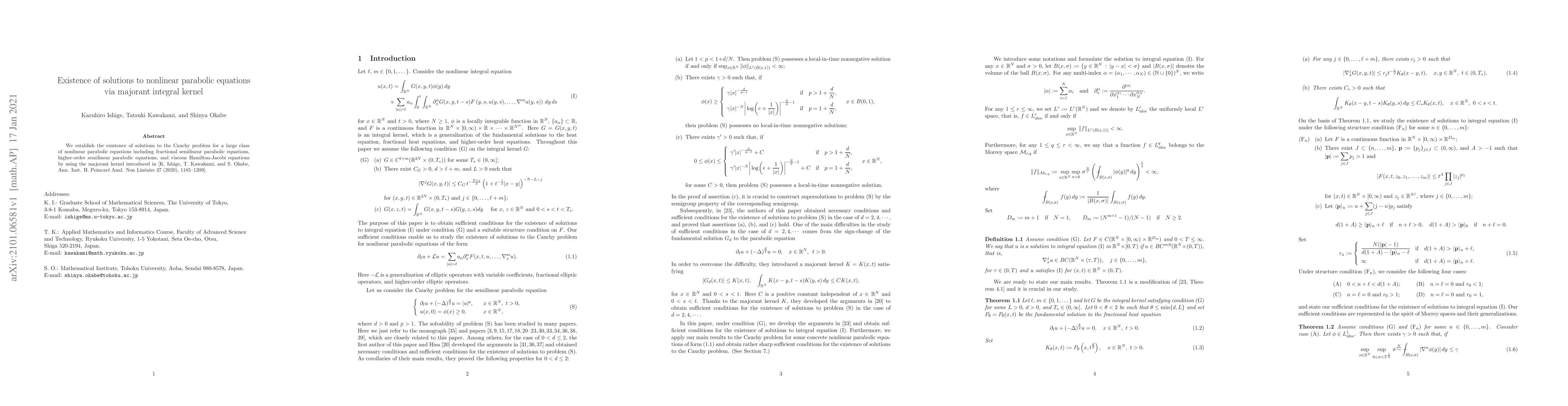 This paper proves the existence of solutions for various nonlinear parabolic equations, including fractional and higher-order semilinear types, using a majorant kernel approach developed by Ishige, Kawakami, and Okabe. The method leverages the majorant kernel to handle complex nonlinearities effectively.