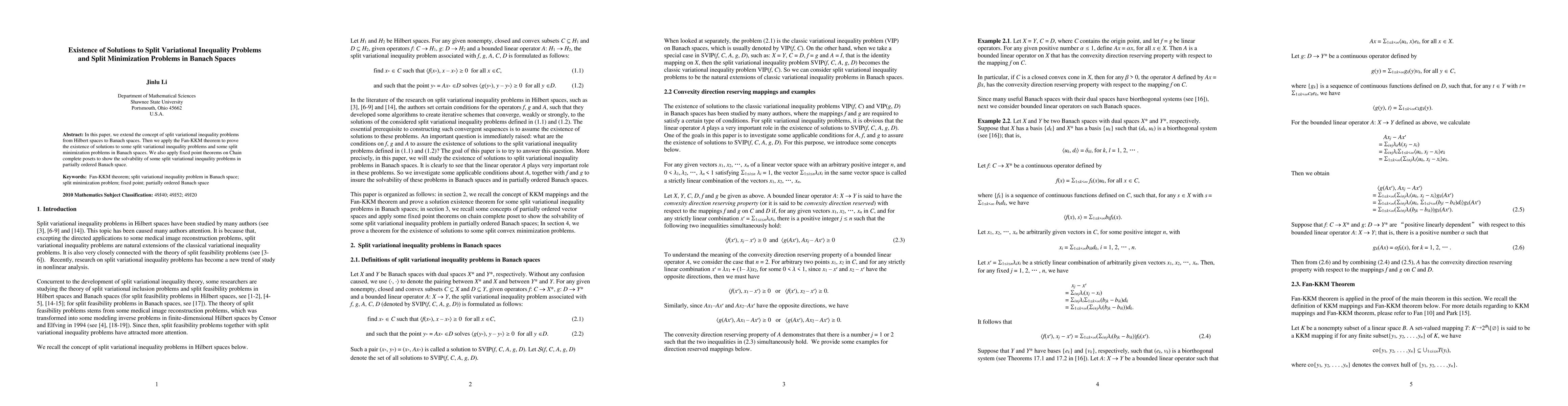This paper extends split variational inequality problems from Hilbert to Banach spaces, proving solution existence via the Fan-KKM theorem and fixed point theorems in partially ordered Banach spaces. It also addresses the solvability of split minimization problems in such settings.