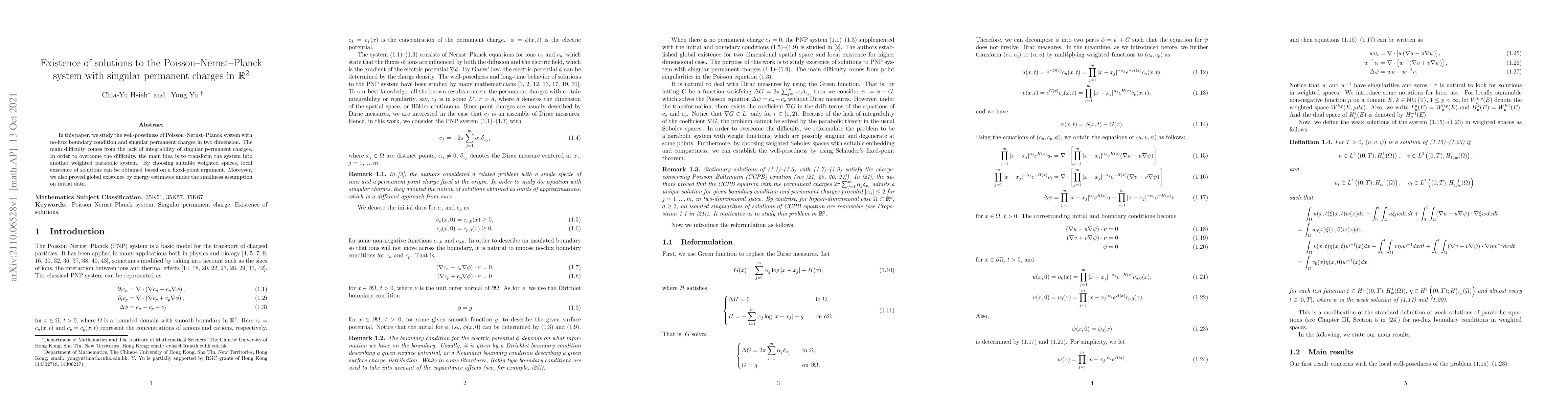 This paper investigates the existence of solutions to the Poisson-Nernst-Planck system in two dimensions with singular permanent charges, transforming the system into a weighted parabolic system to overcome integrability issues. Local and global existence are proven using fixed-point arguments and energy estimates under small initial data conditions.