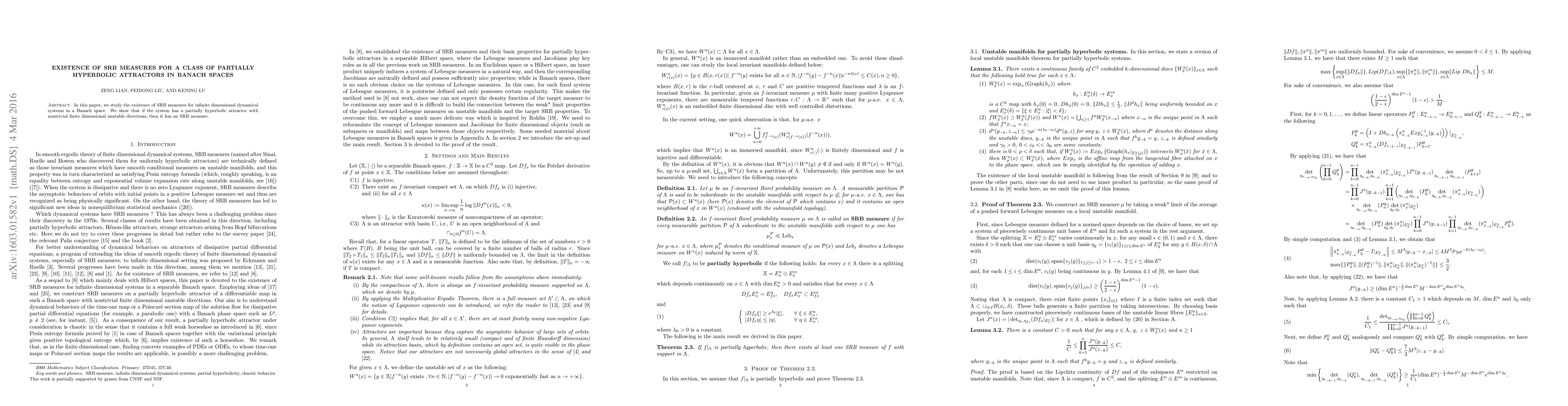 The paper investigates the existence of SRB (Sinai-Ruelle-Bowen) measures for infinite-dimensional dynamical systems in Banach spaces, specifically focusing on systems with partially hyperbolic attractors and nontrivial finite-dimensional unstable directions.