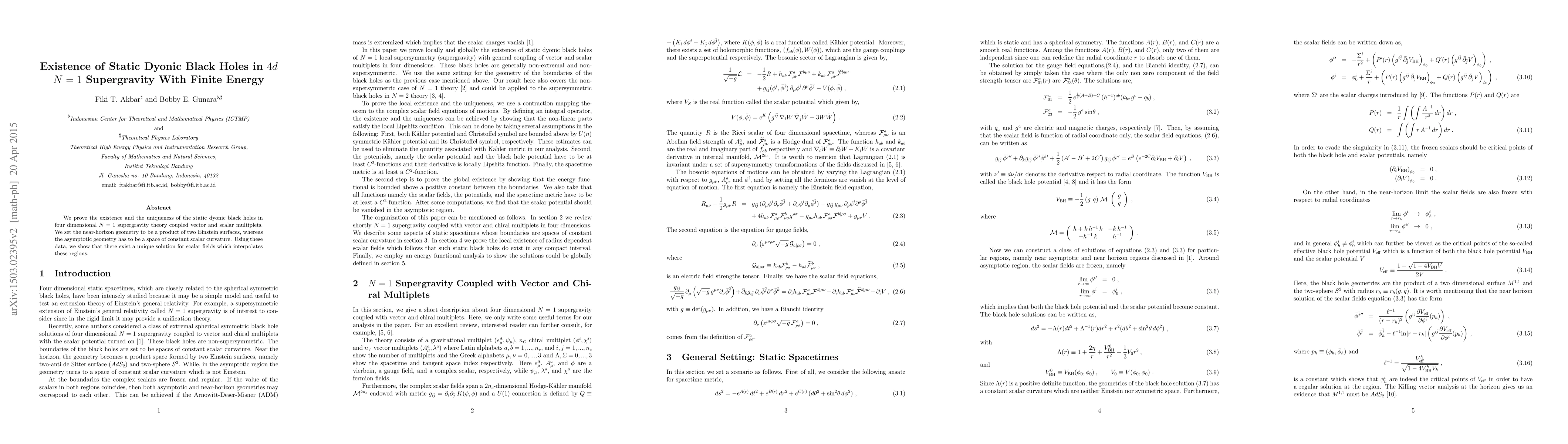 This paper proves the existence and uniqueness of static dyonic black holes in $4d$ $N=1$ supergravity with finite energy. It establishes a unique solution for scalar fields that interpolate between the near-horizon geometry of two Einstein surfaces and the asymptotically constant scalar curvature space.