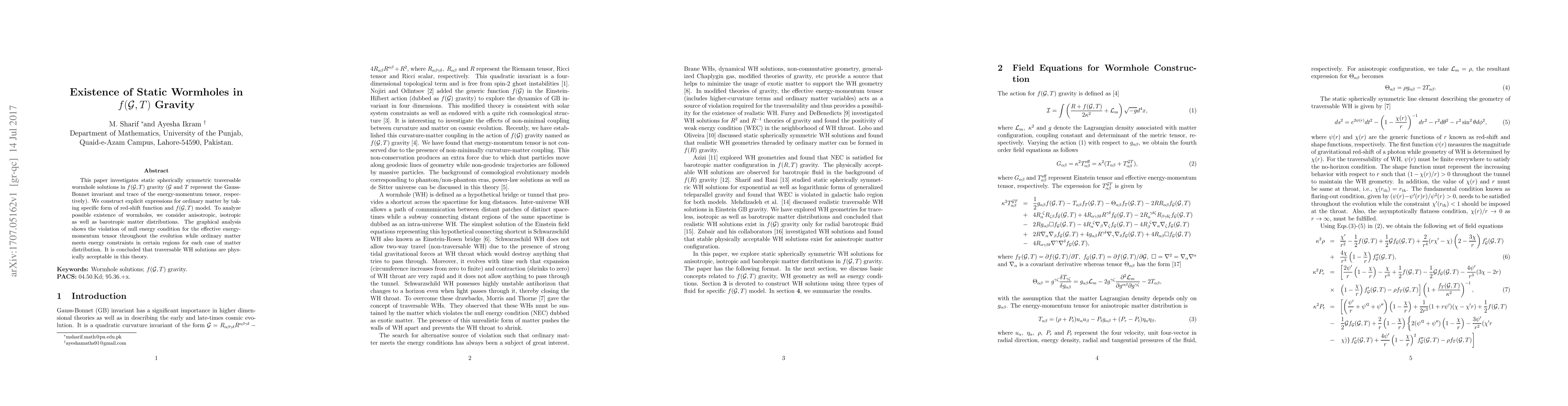 This paper explores static spherically symmetric wormholes in $f(\mathcal{G},T)$ gravity, finding traversable solutions under various matter distributions. The study concludes that these wormholes are physically viable, with the effective energy-momentum tensor violating the null energy condition.
