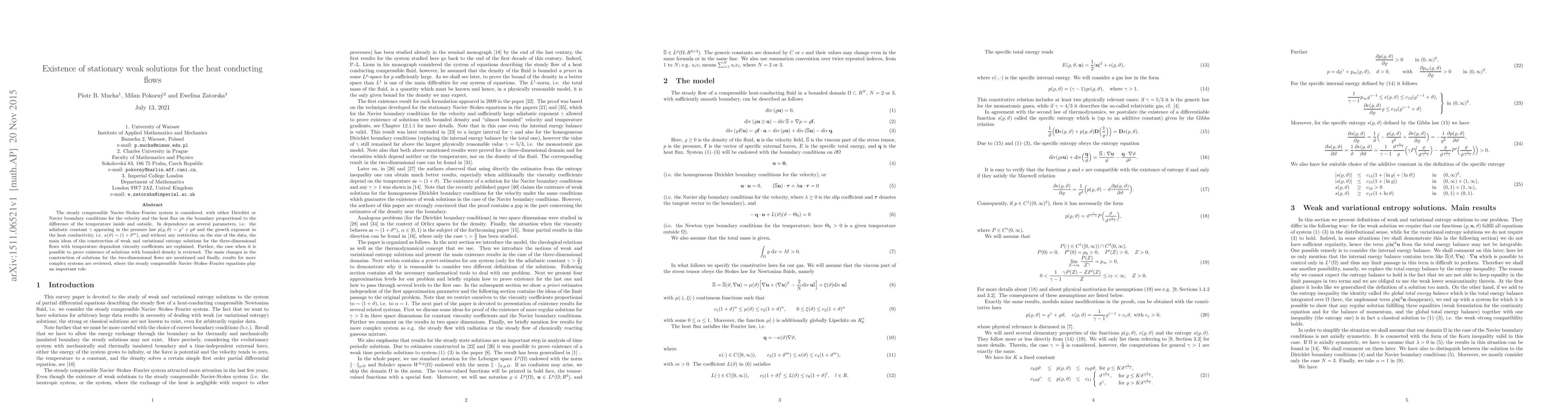 The steady compressible Navier--Stokes--Fourier system is considered, with either Dirichlet or Navier boundary conditions for the velocity and the heat flux on the boundary proportional to the difference of the temperature inside and outside. In dependence on several parameters, i.e. the adiabatic constant $\gamma$ appearing in the pressure law $p(\vr,\vt) \sim \vr^\gamma + \vr \vt$ and the growth exponent in the heat conductivity, i.e. $\kappa(\vt) \sim (1+ \vt^m)$, and without any restriction on the size of the data, the main ideas of the construction of weak and variational entropy solutions for the three-dimensional flows with temperature dependent viscosity coefficients are explained. Further, the case when it is possible to prove existence of solutions with bounded density is reviewed. The main changes in the construction of solutions for the two-dimensional flows are mentioned and finally, results for more complex systems are reviewed, where the steady compressible Navier--Stokes--Fourier equations play an important role.