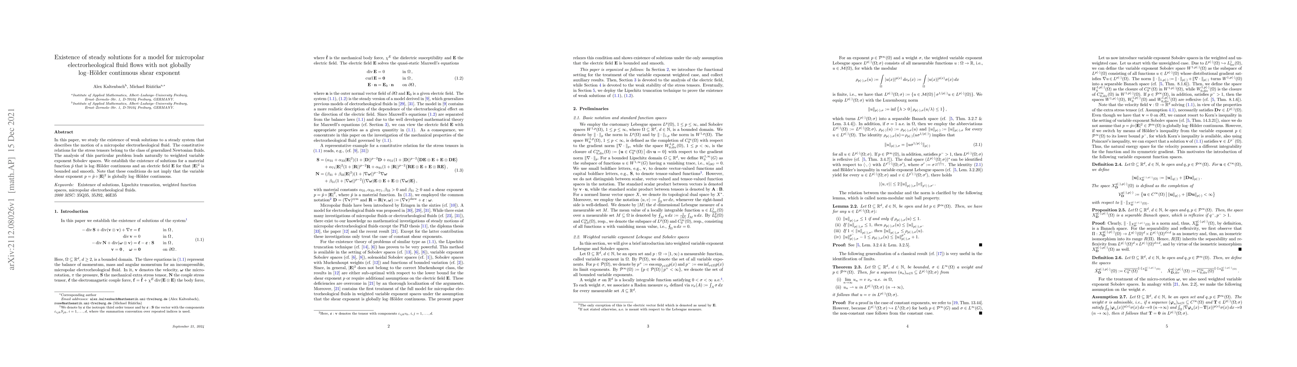 In this paper, we study the existence of weak solutions to a steady system that describes the motion of a micropolar electrorheological fluid. The constitutive relations for the stress tensors belong to the class of generalized Newtonian fluids. The analysis of this particular problem leads naturally to weighted variable exponent Sobolev spaces. We establish the existence of solutions for a material function $\hat p$ that is $\log$--H\"older continuous and an electric field $\mathbf{E}$ for that $\vert\mathbf{E}\vert^2$ is bounded and smooth. Note that these conditions do not imply that the variable shear exponent $p=\hat p\circ\vert \mathbf{E}\vert^2$ is globally $\log$--H\"older continuous.
