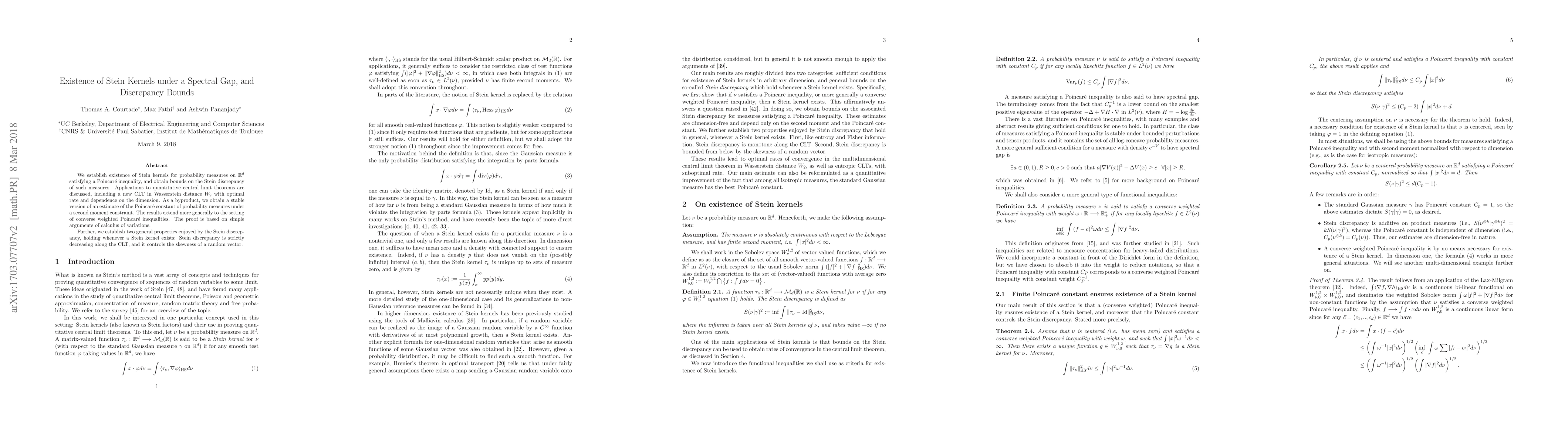 This paper establishes the existence of Stein kernels for probability measures on $\mathbb{R}^d$ with a Poincaré inequality and provides bounds on the Stein discrepancy. It discusses applications to quantitative central limit theorems, including an optimal CLT in Wasserstein distance $W_2$, and establishes two properties of Stein discrepancy: it decreases along the CLT and controls skewness.