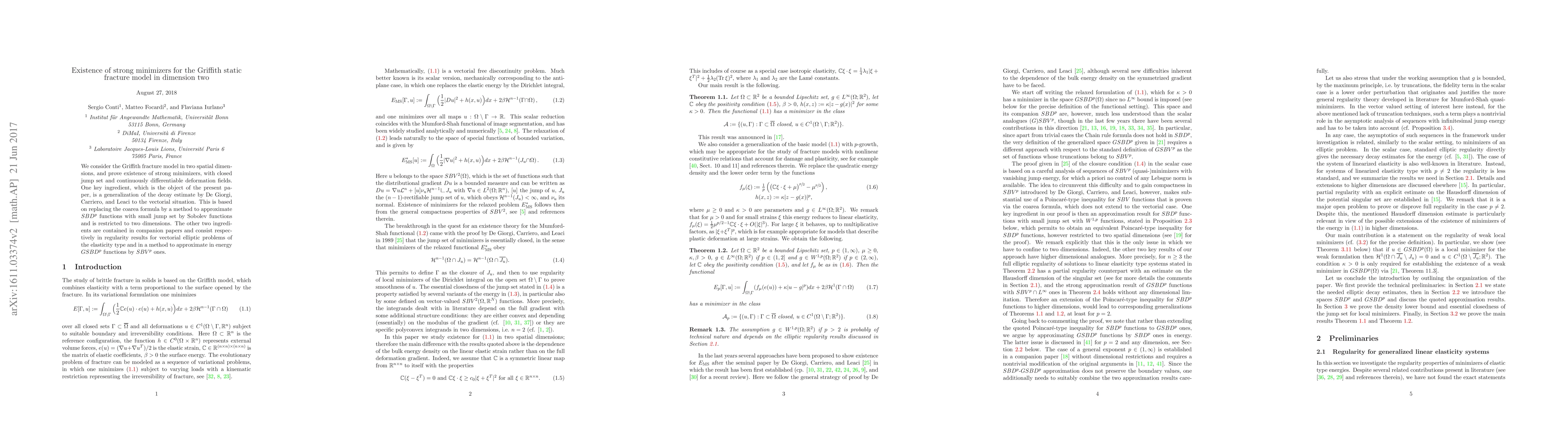 Researchers prove existence of strong minimizers for a fracture model in 2D space, using a combination of methods to approximate functions with certain properties.