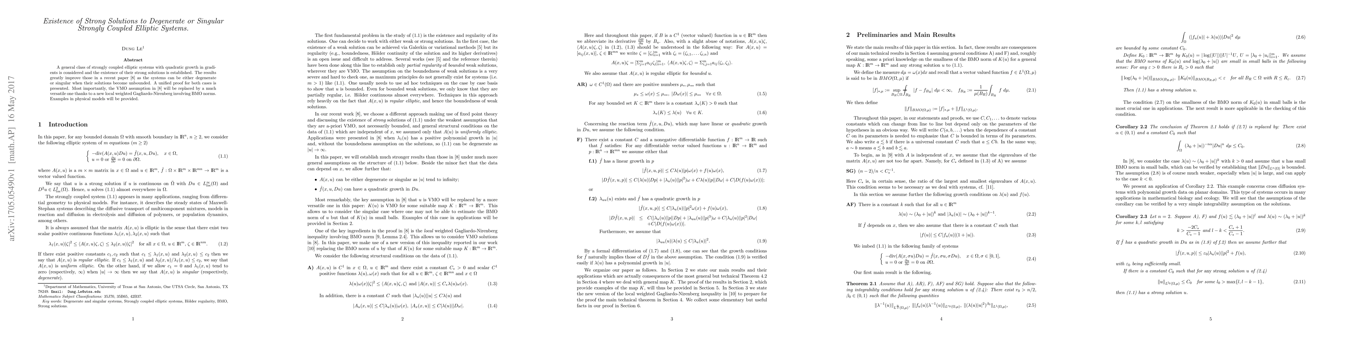 A general class of strongly coupled elliptic systems with quadratic growth in gradients is considered and the existence of their strong solutions is established. The results greatly improve those in a recent paper \cite{dleJFA} as the systems can be either degenerate or singular when their solutions become unbounded. A unified proof for both cases is presented. Most importantly, the VMO assumption in \cite{dleJFA} will be replaced by a much versatile one thanks to a new local weighted Gagliardo-Nirenberg involving BMO norms. Examples in physical models will be provided.