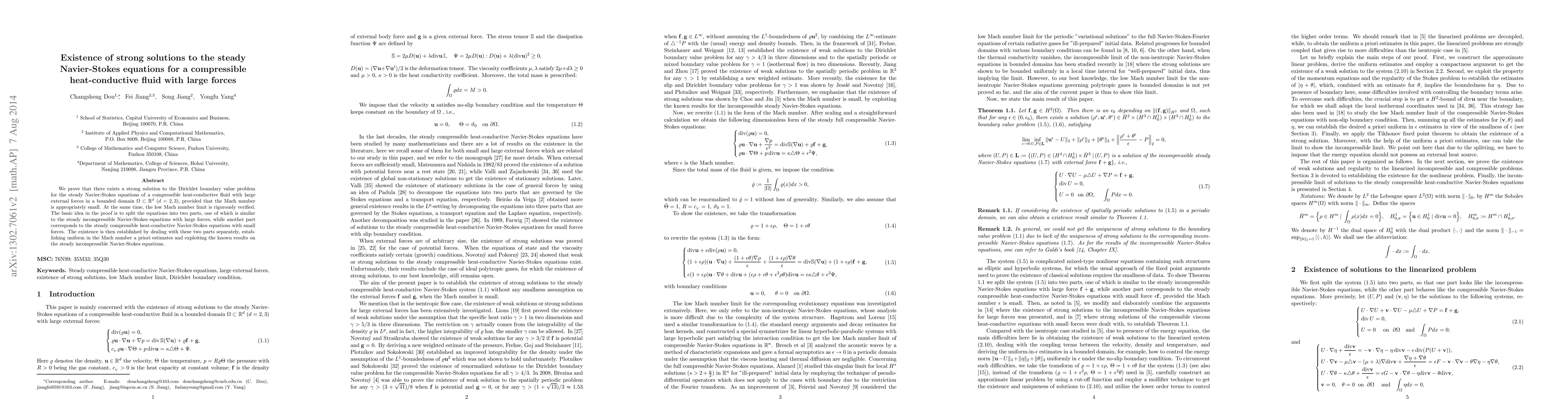 This paper proves the existence of strong solutions for the steady Navier-Stokes equations governing compressible heat-conductive fluids under large forces, provided the Mach number is sufficiently small. The proof involves splitting the equations into parts resembling steady incompressible and compressible heat-conductive Navier-Stokes equations, establishing uniform a priori estimates, and leveraging known results for incompressible flows.